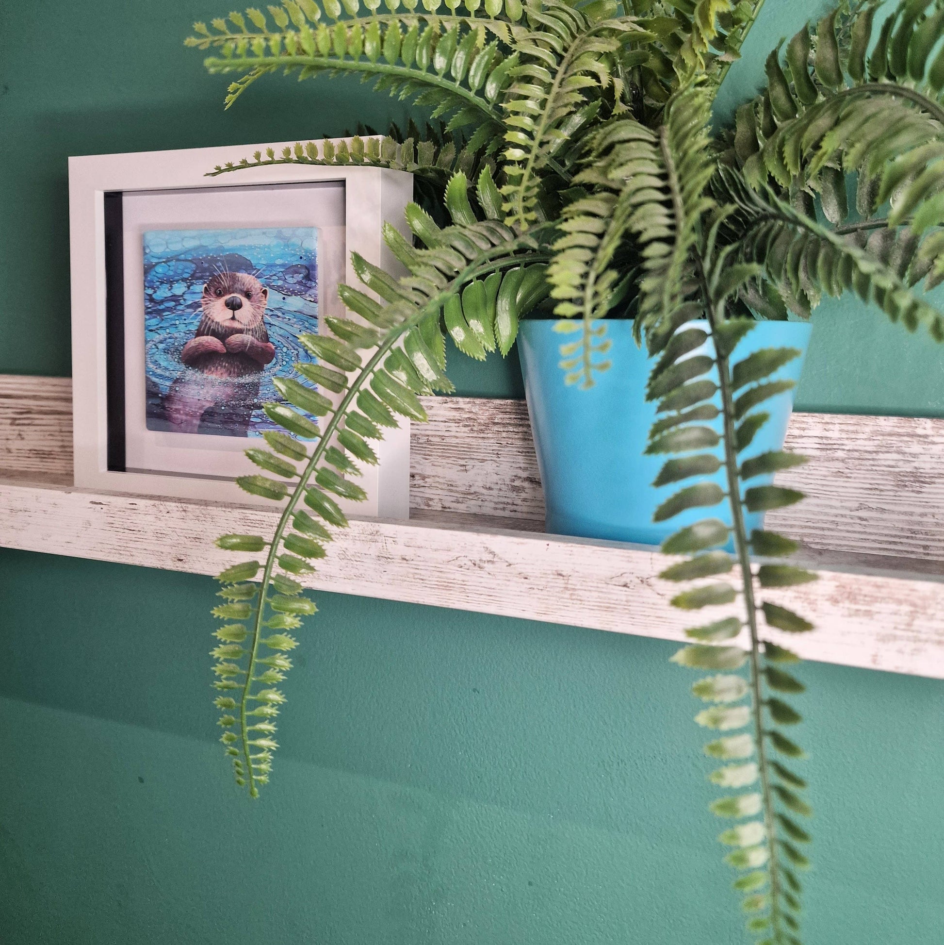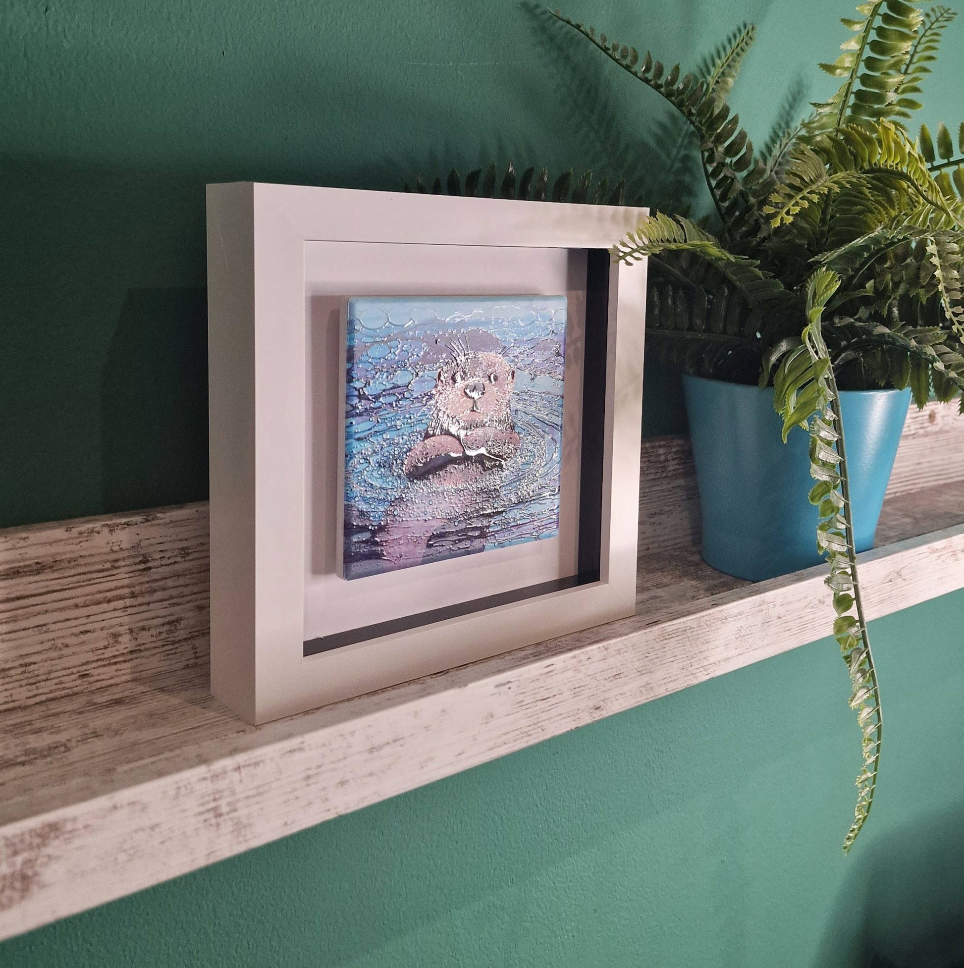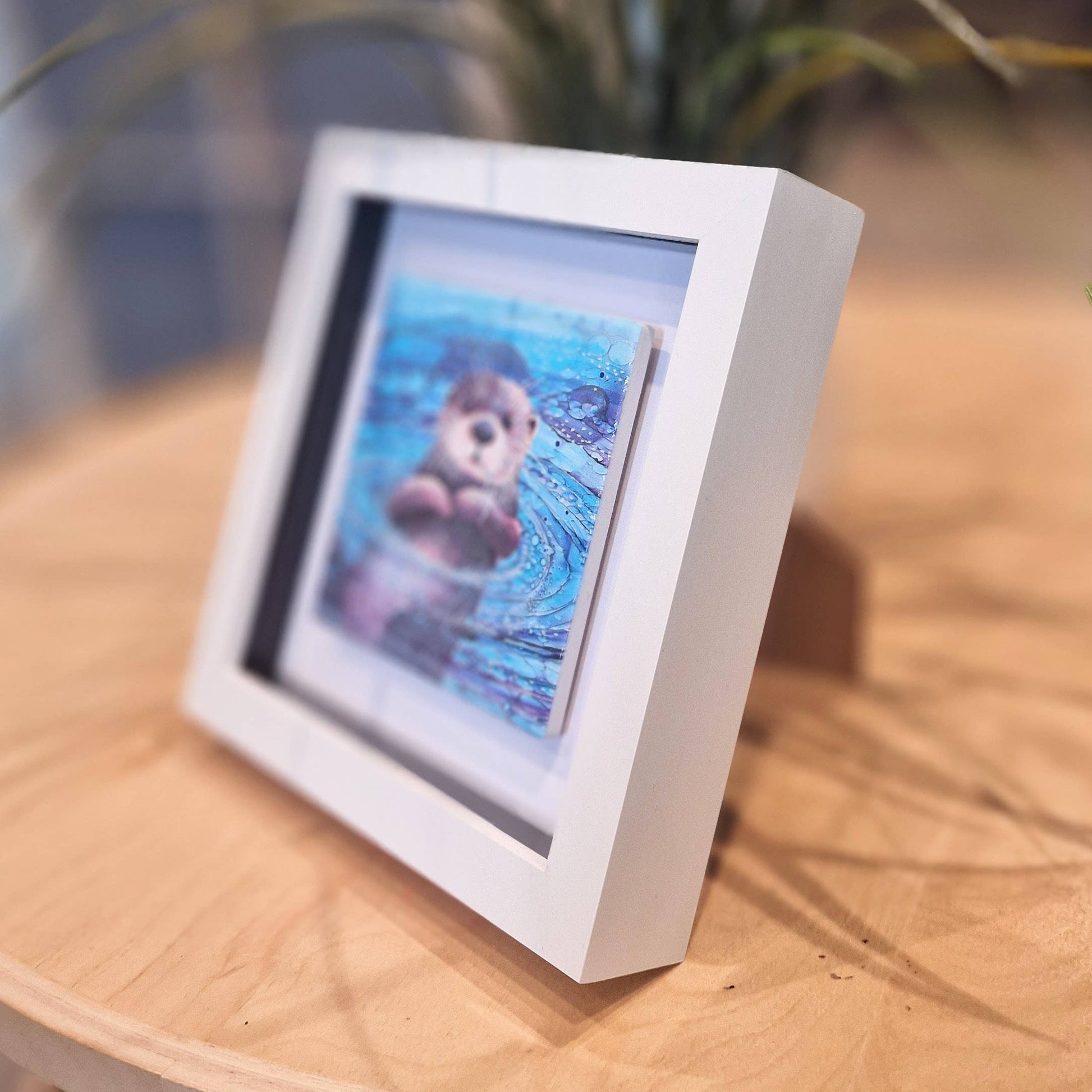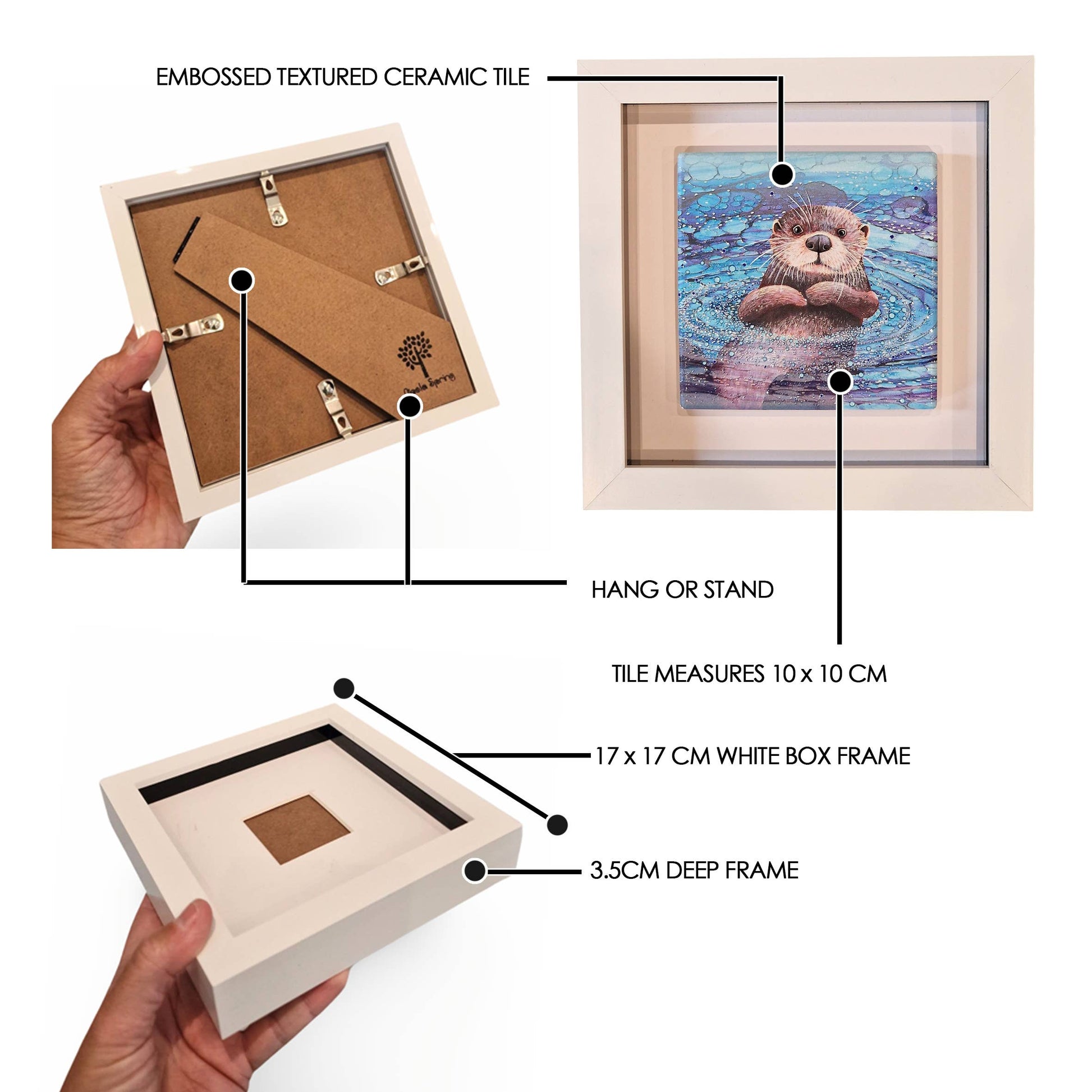 Because of the design of the frame the artwork can be hung on a wall, stand solo on a shelf or be leant back on their stand.