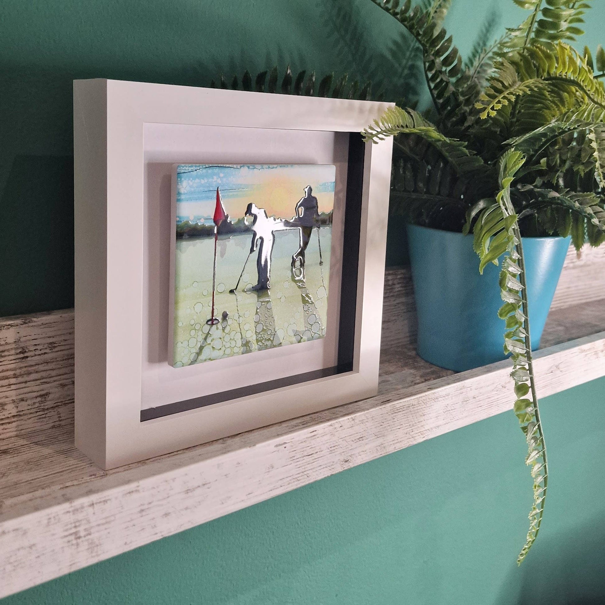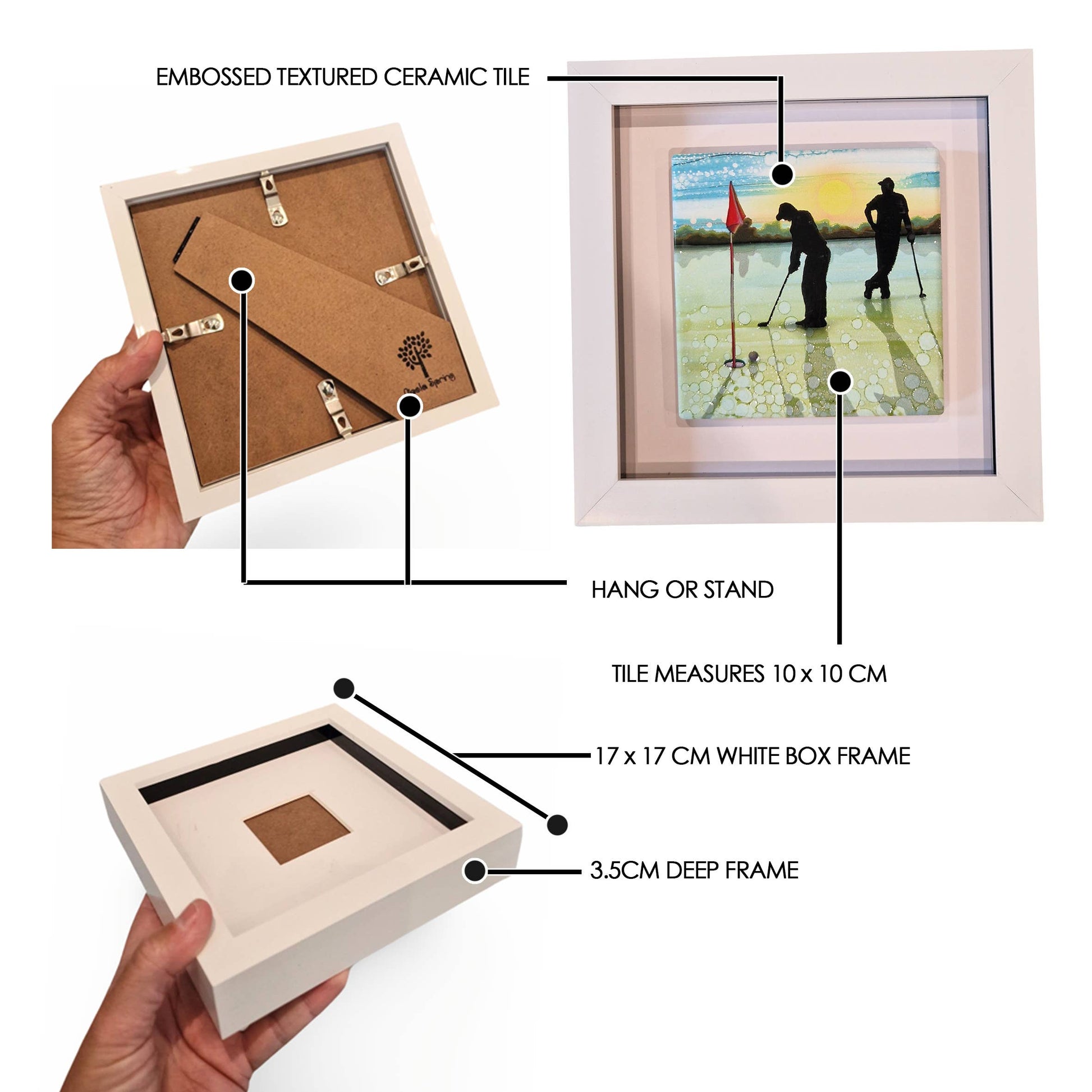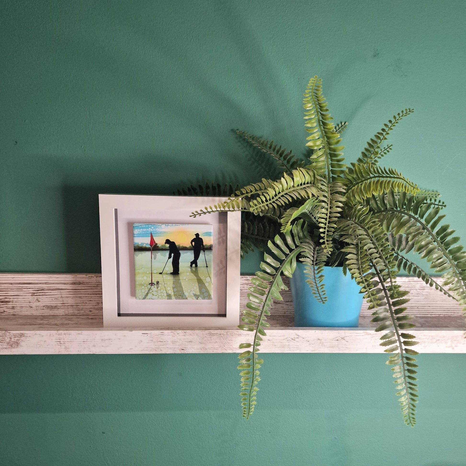 Because of the design of the frame the artwork can be hung on a wall, stand solo on a shelf or be leant back on their stand.