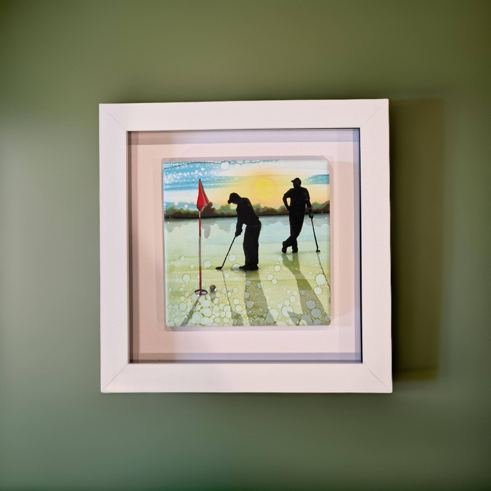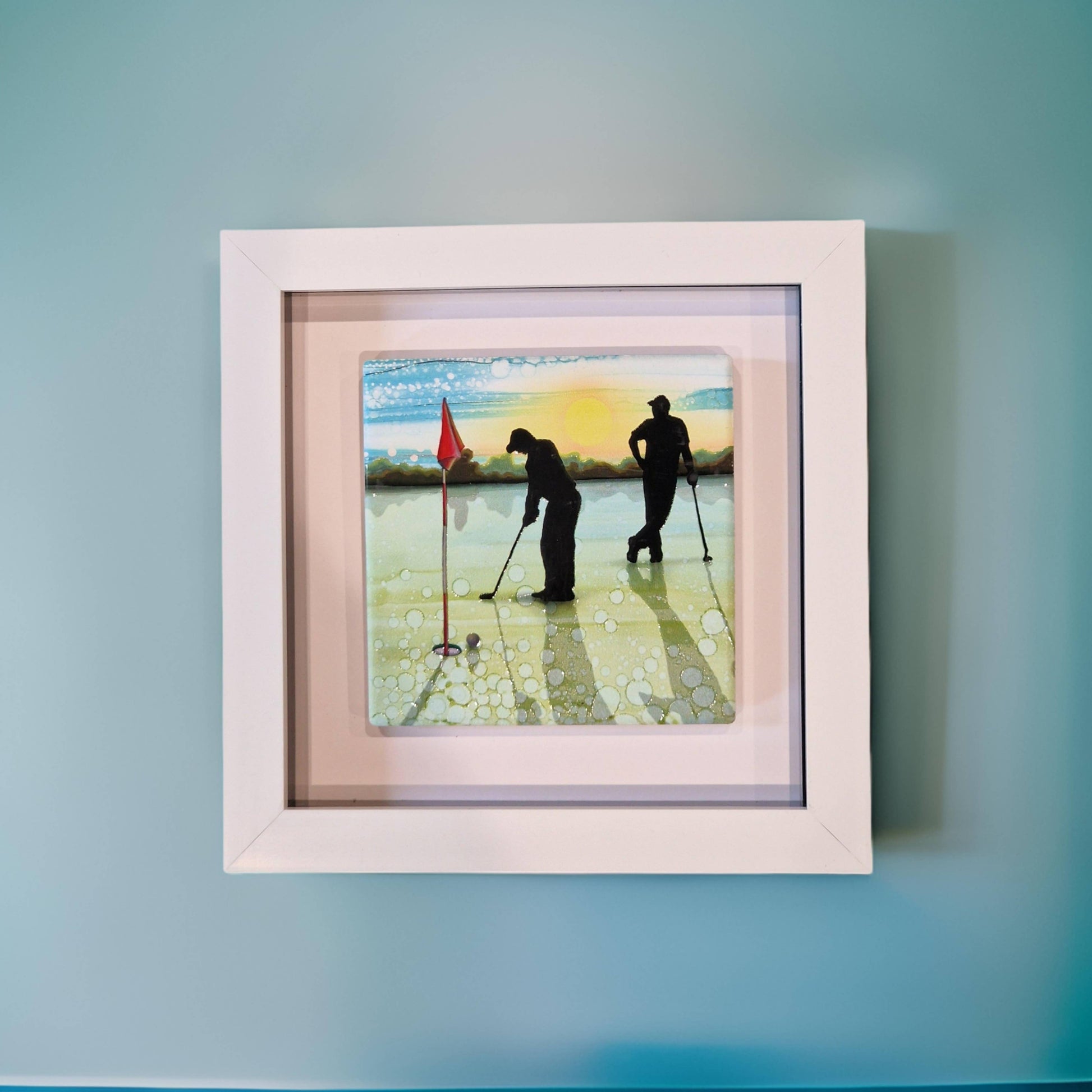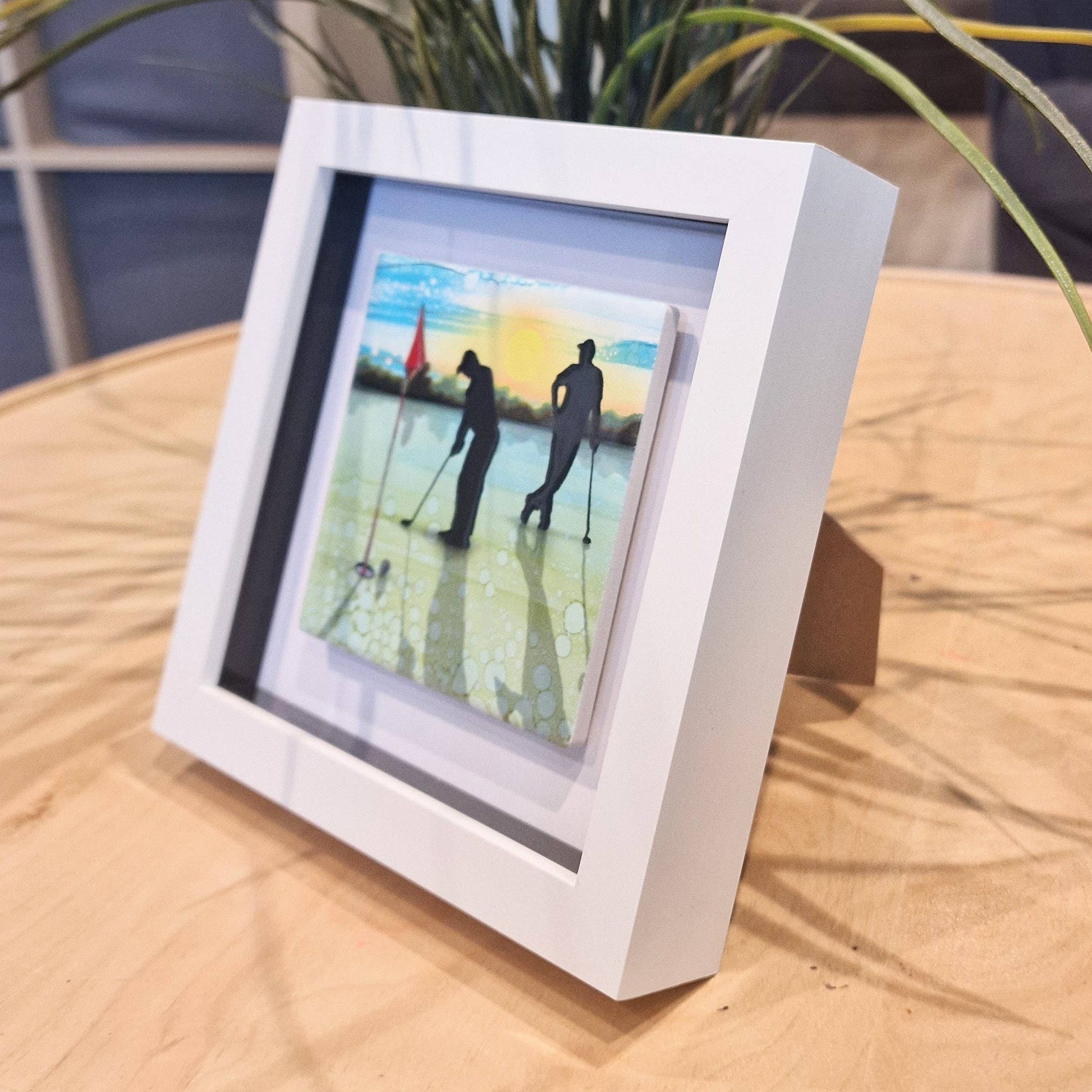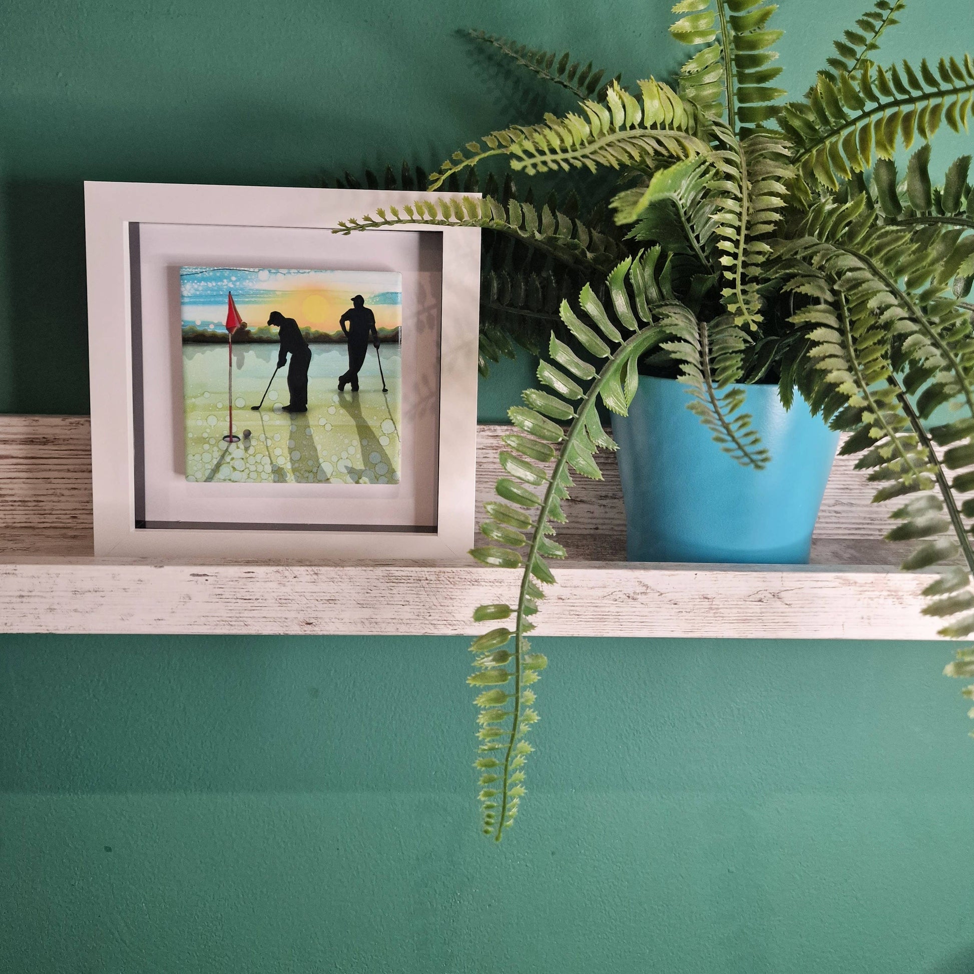 Because of the design of the frame the artwork can be hung on a wall, stand solo on a shelf or be leant back on their stand.