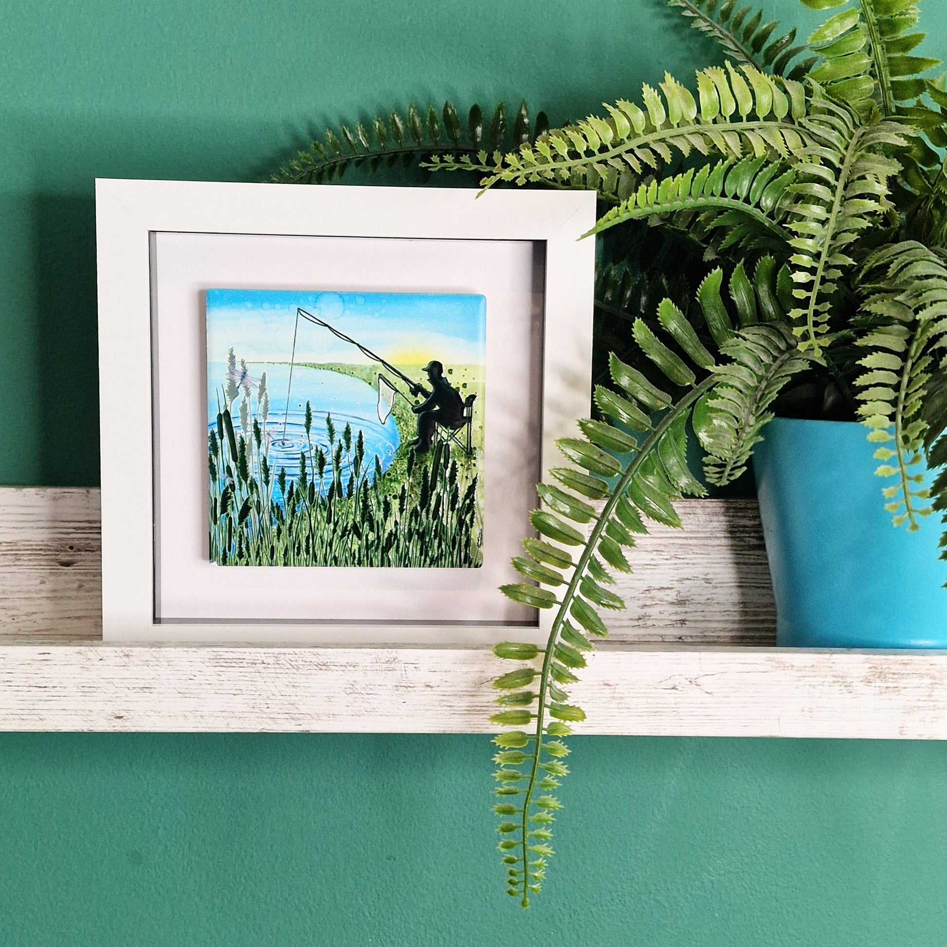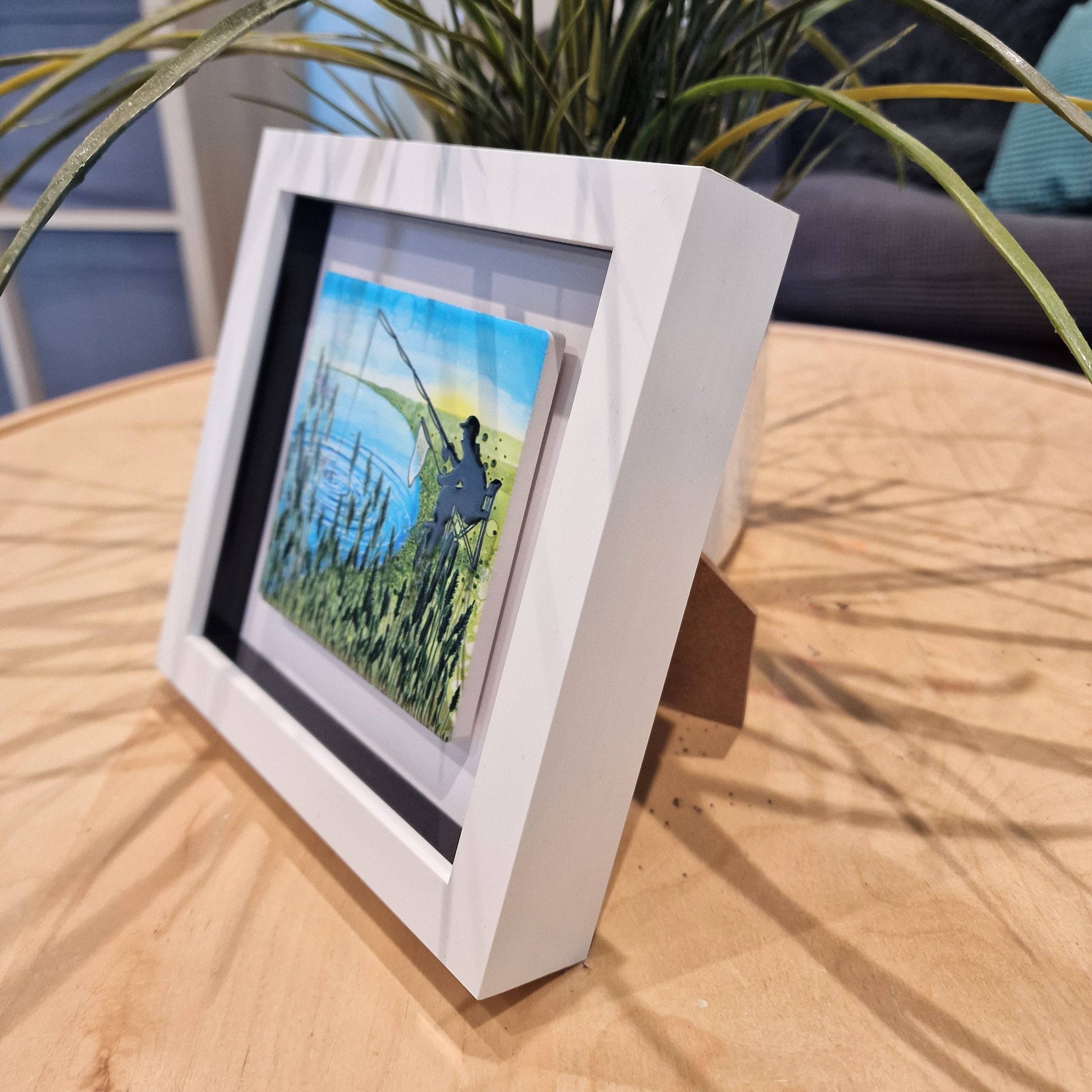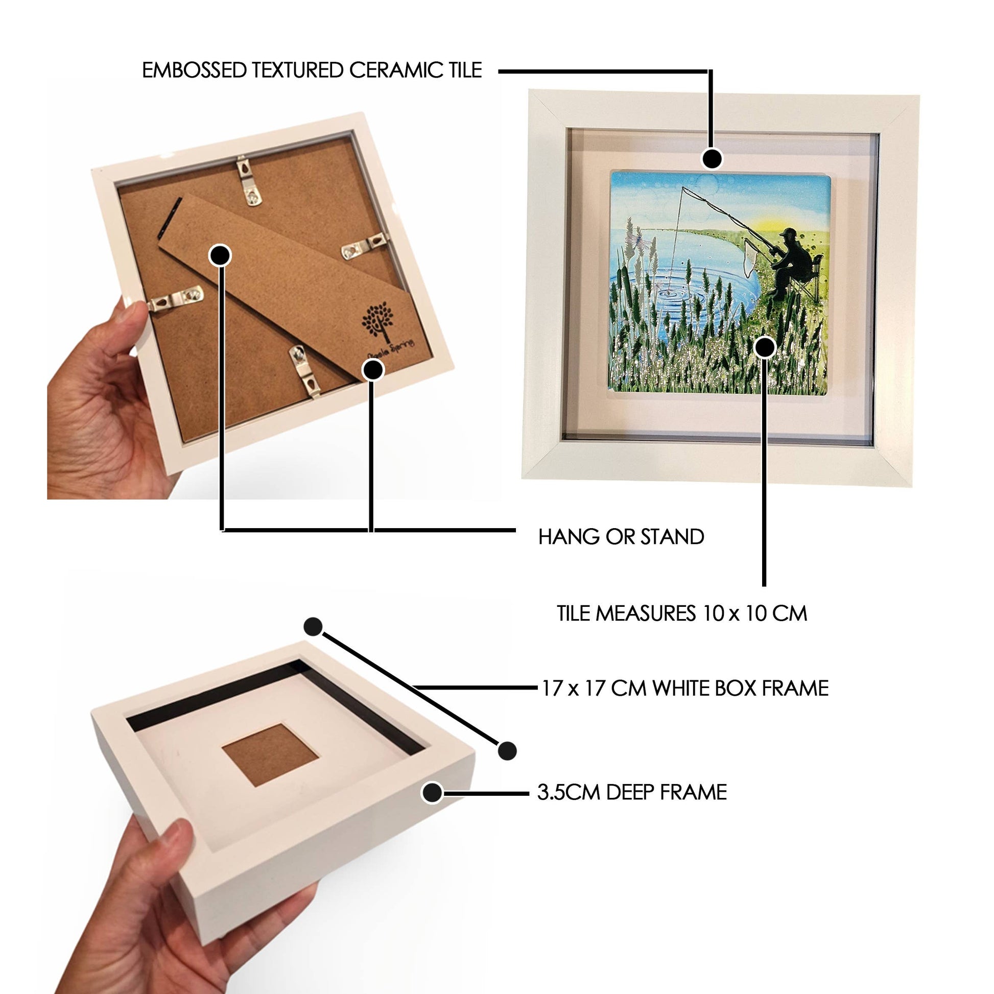 Because of the design of the frame the artwork can be hung on a wall, stand solo on a shelf or be leant back on their stand.