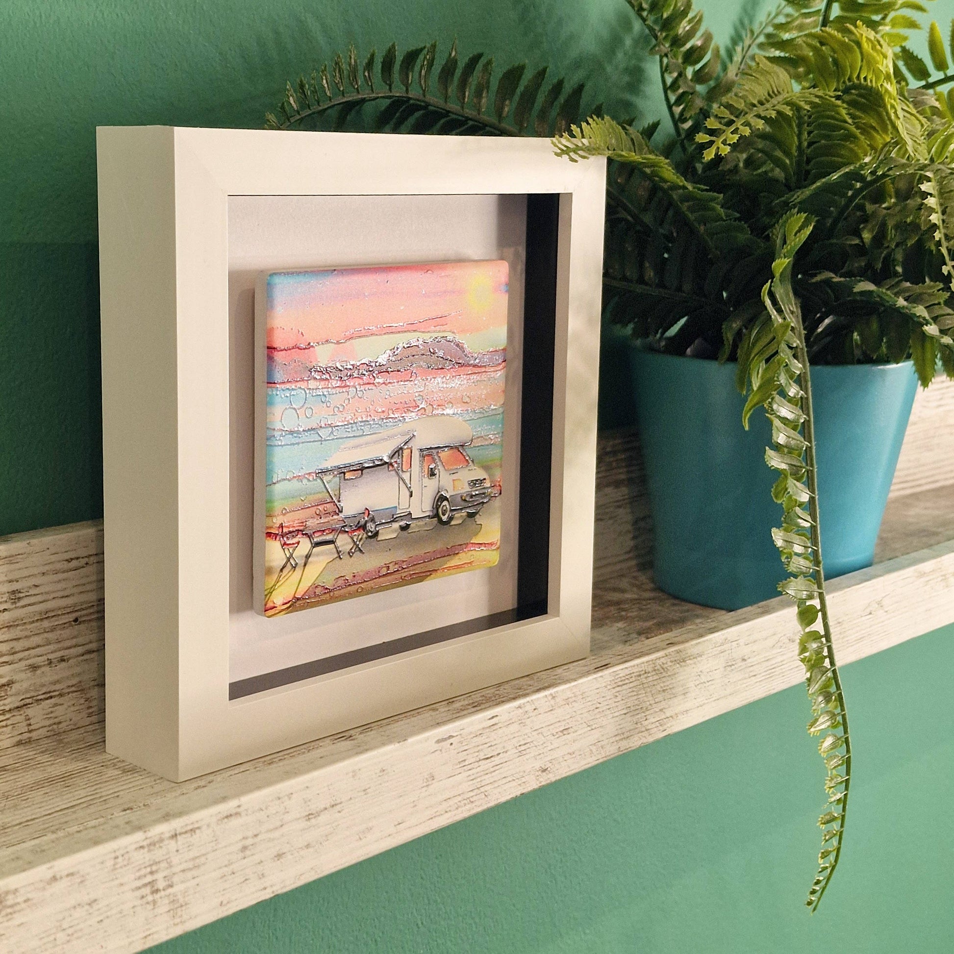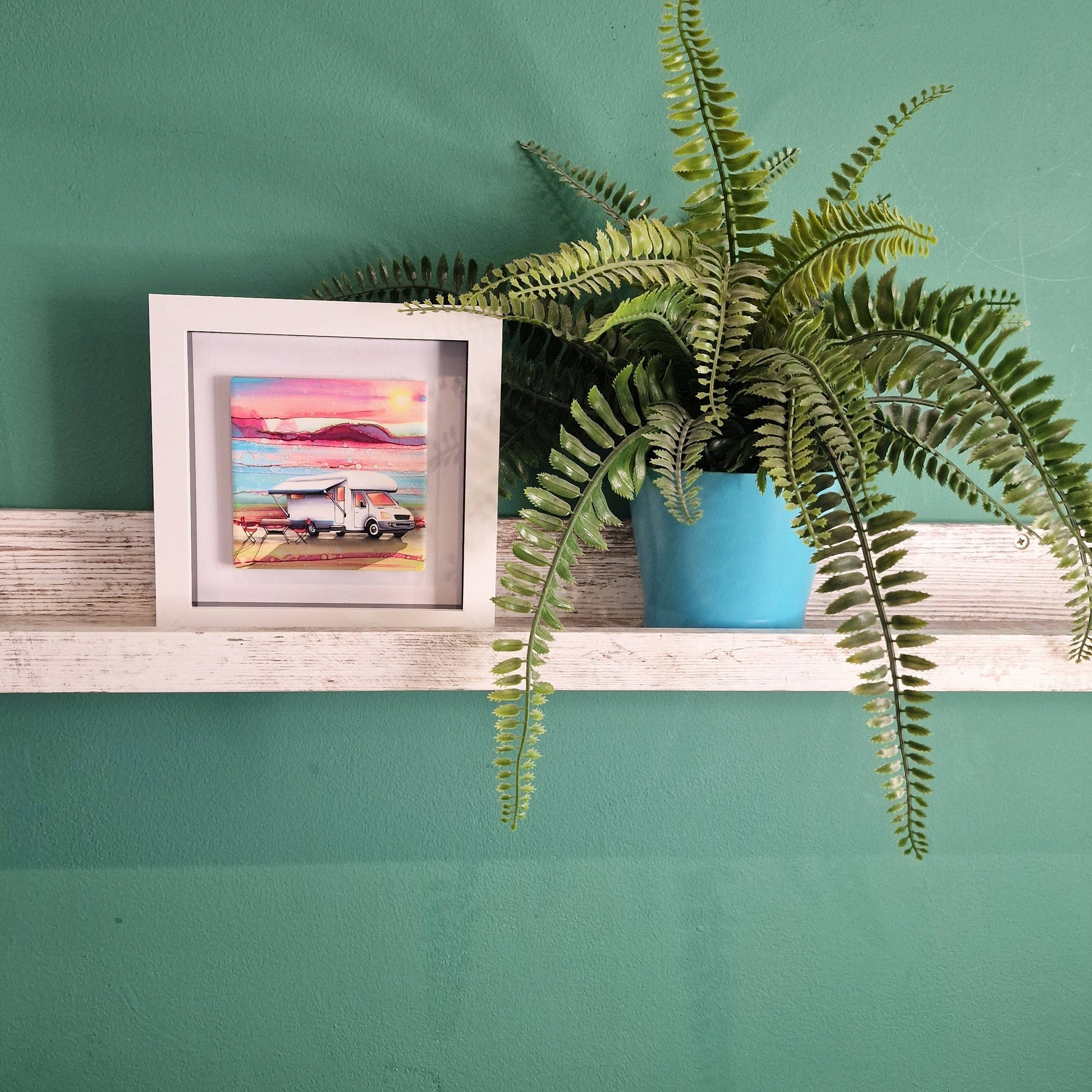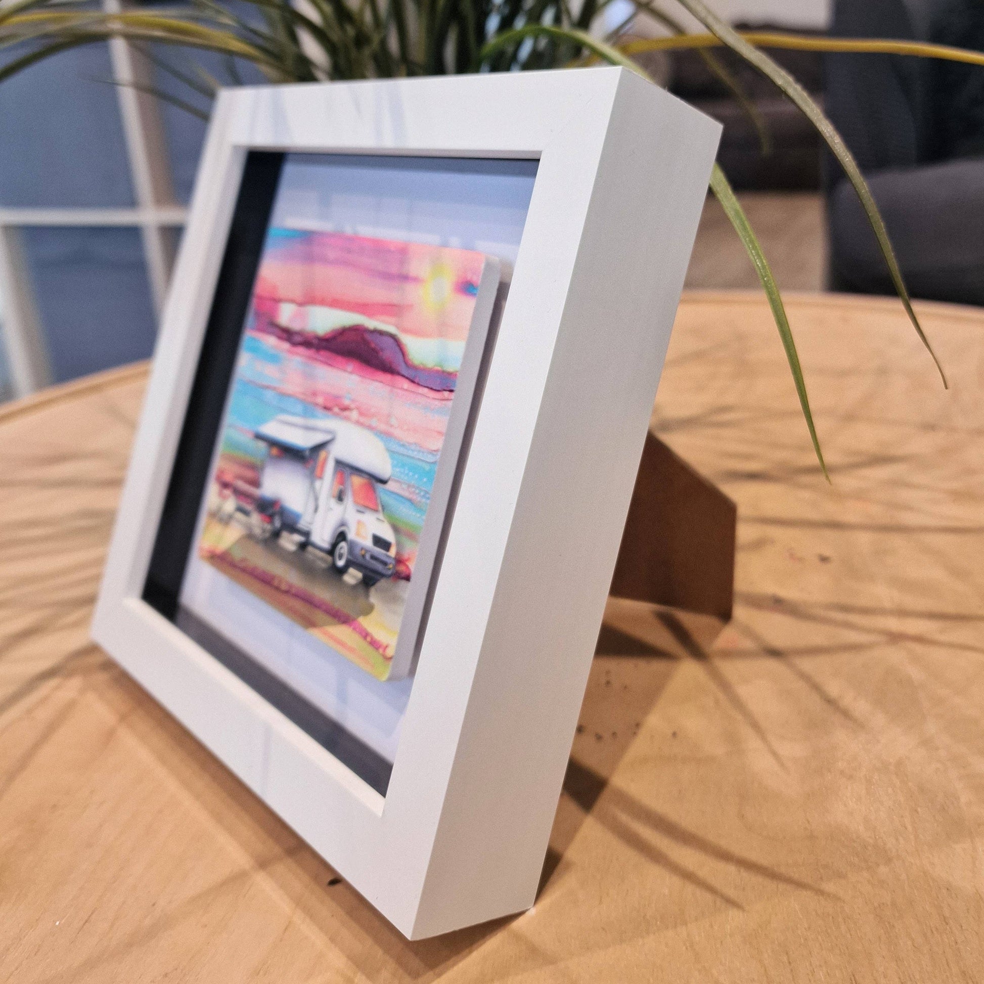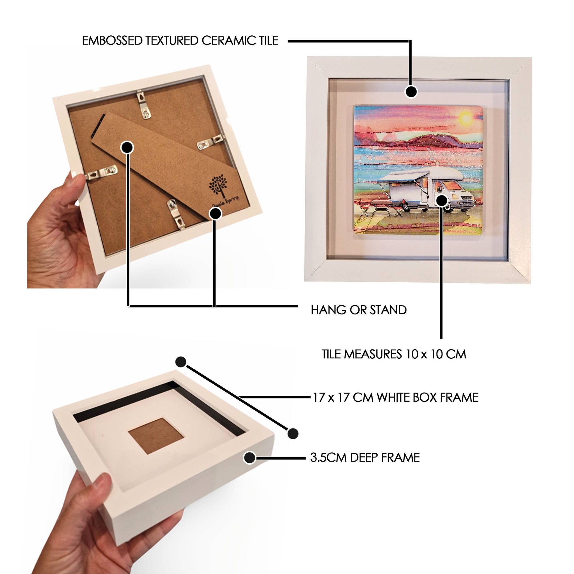 Because of the design of the frame the artwork can be hung on a wall, stand solo on a shelf or be leant back on their stand.
