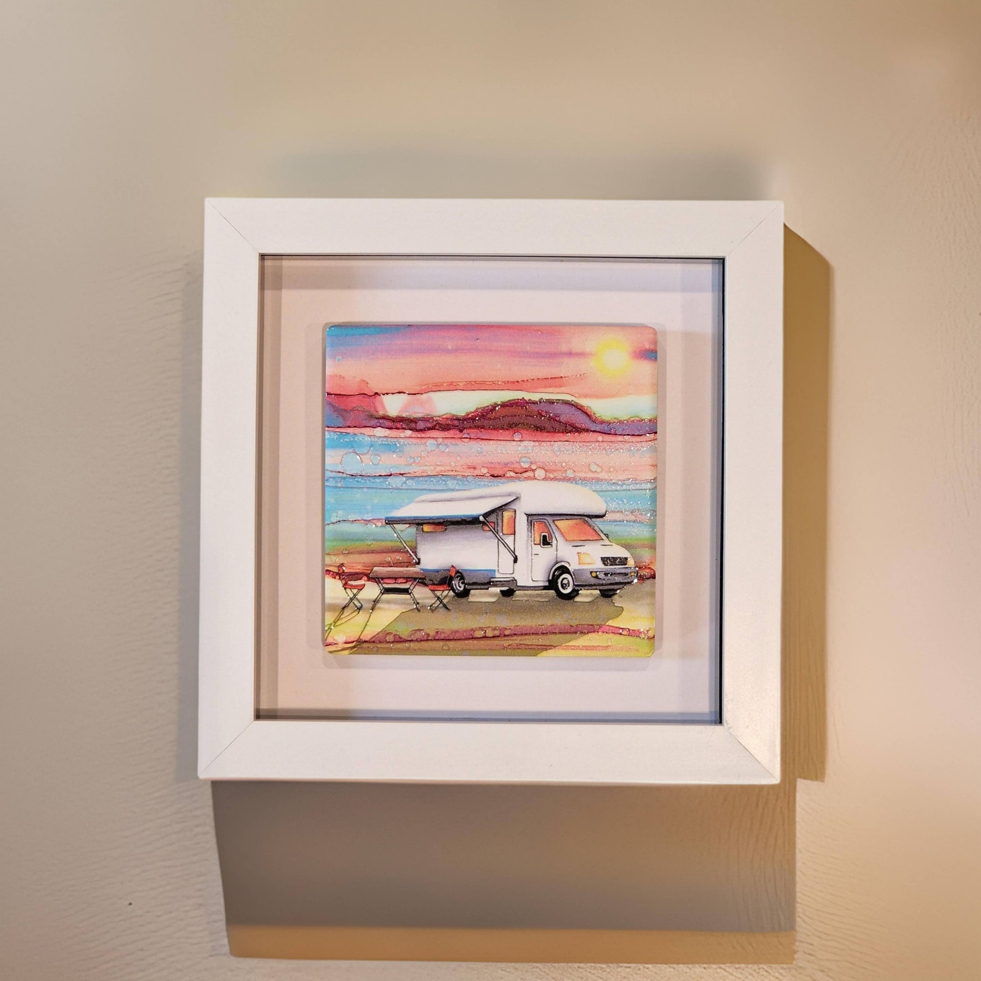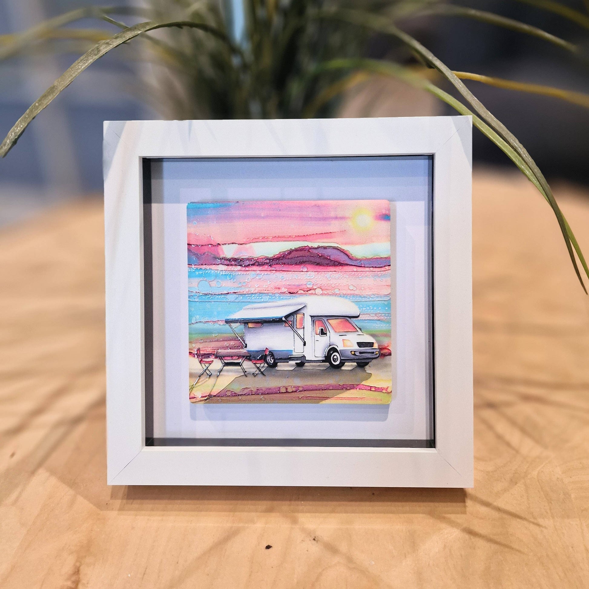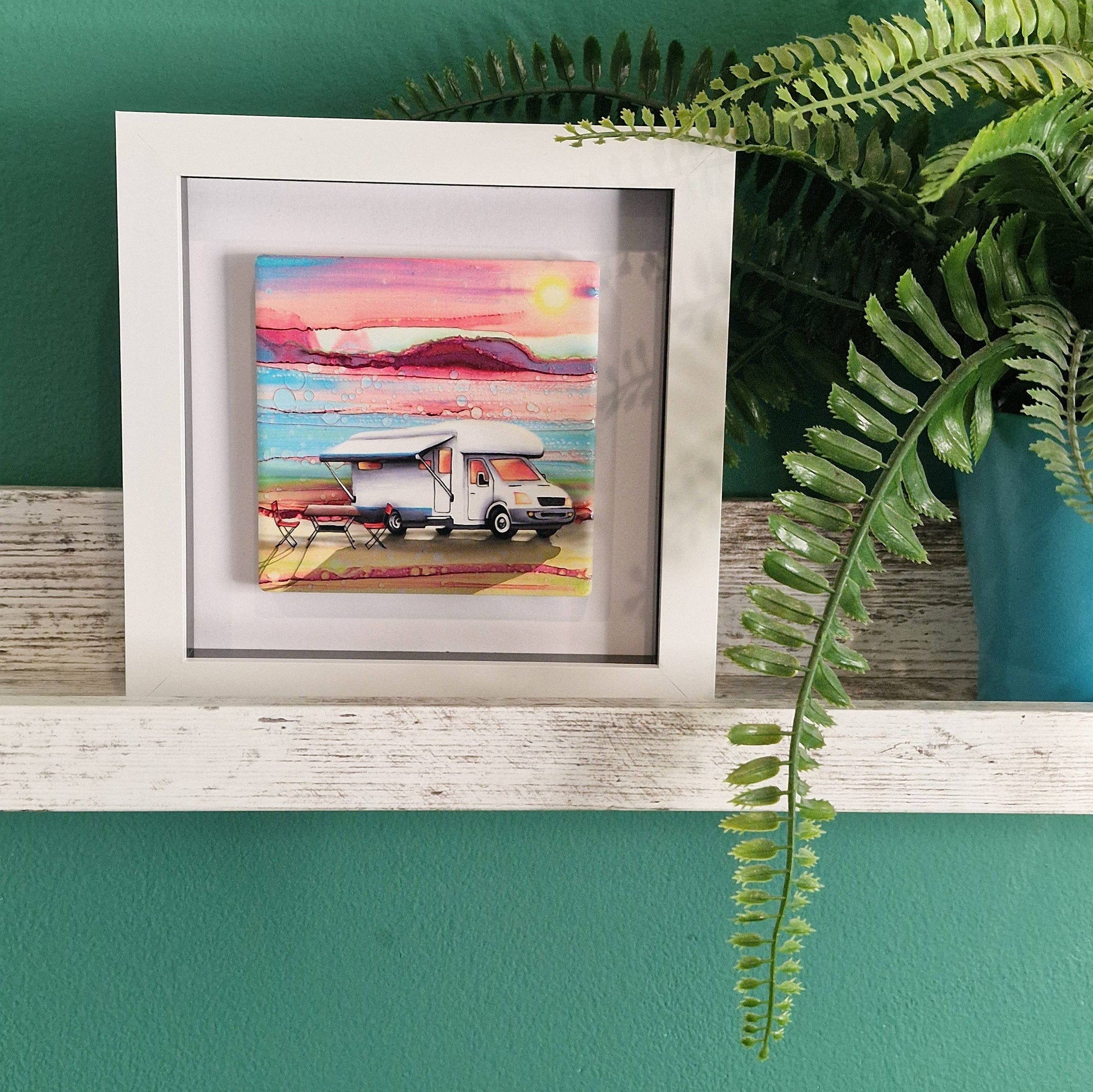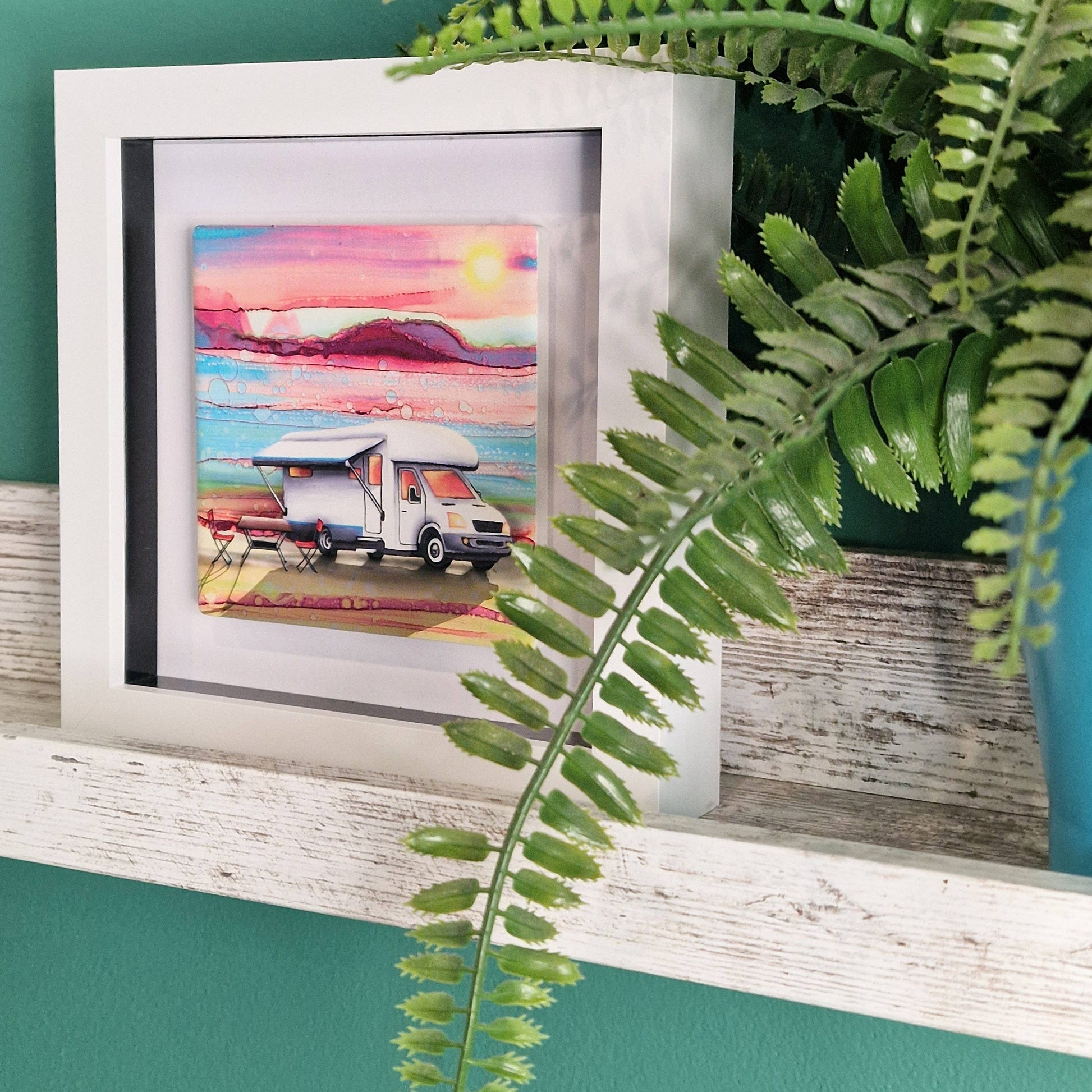 Because of the design of the frame the artwork can be hung on a wall, stand solo on a shelf or be leant back on their stand.