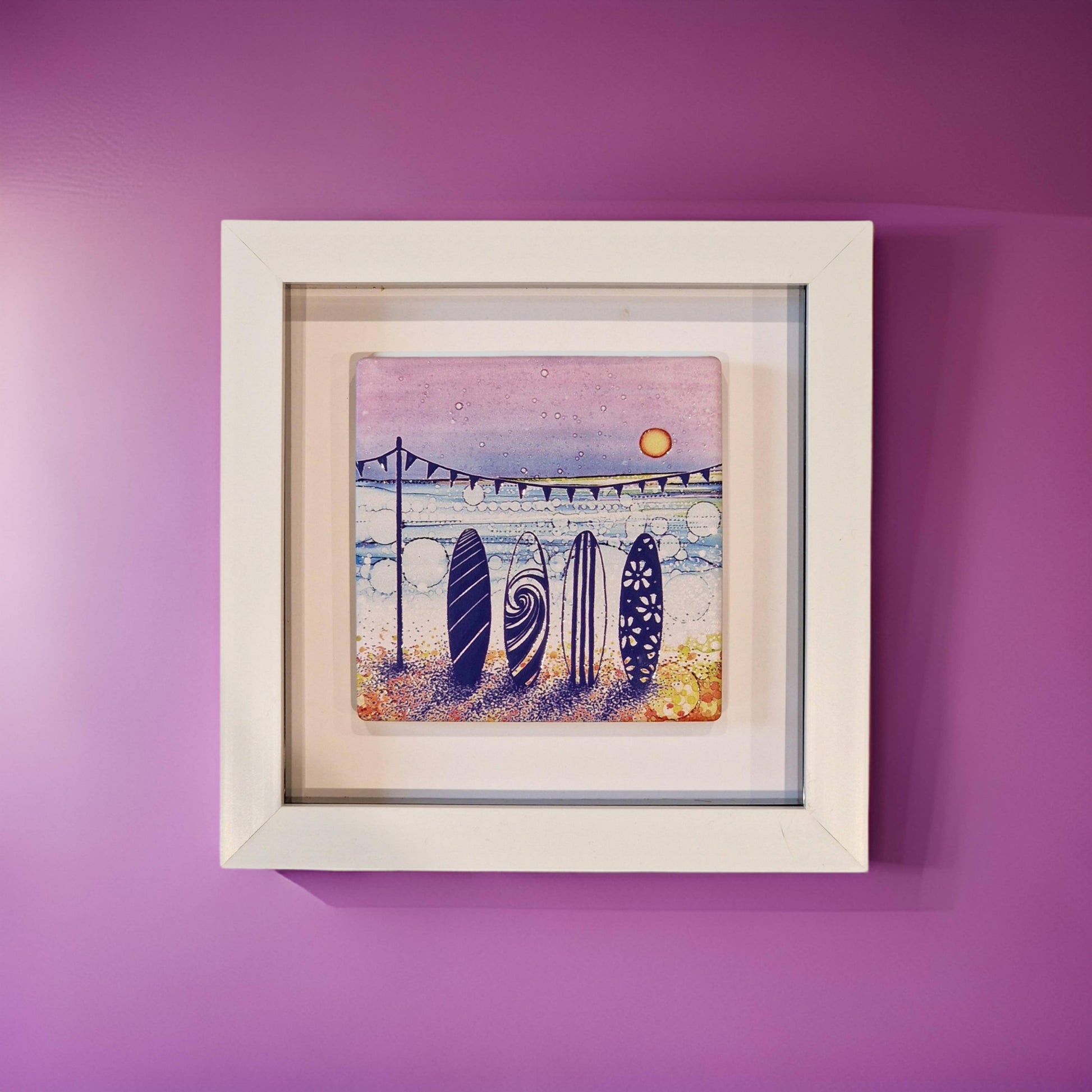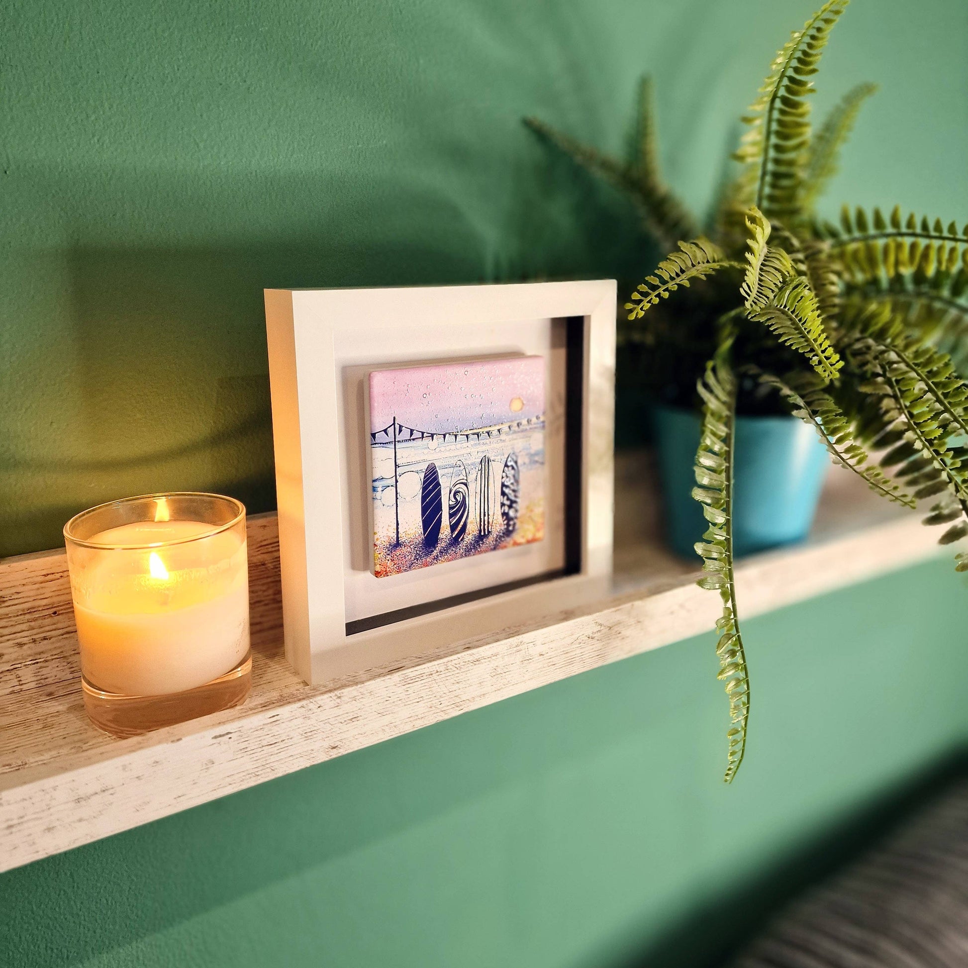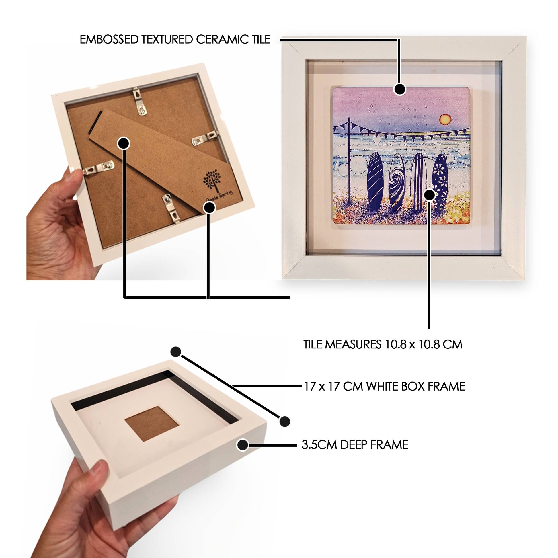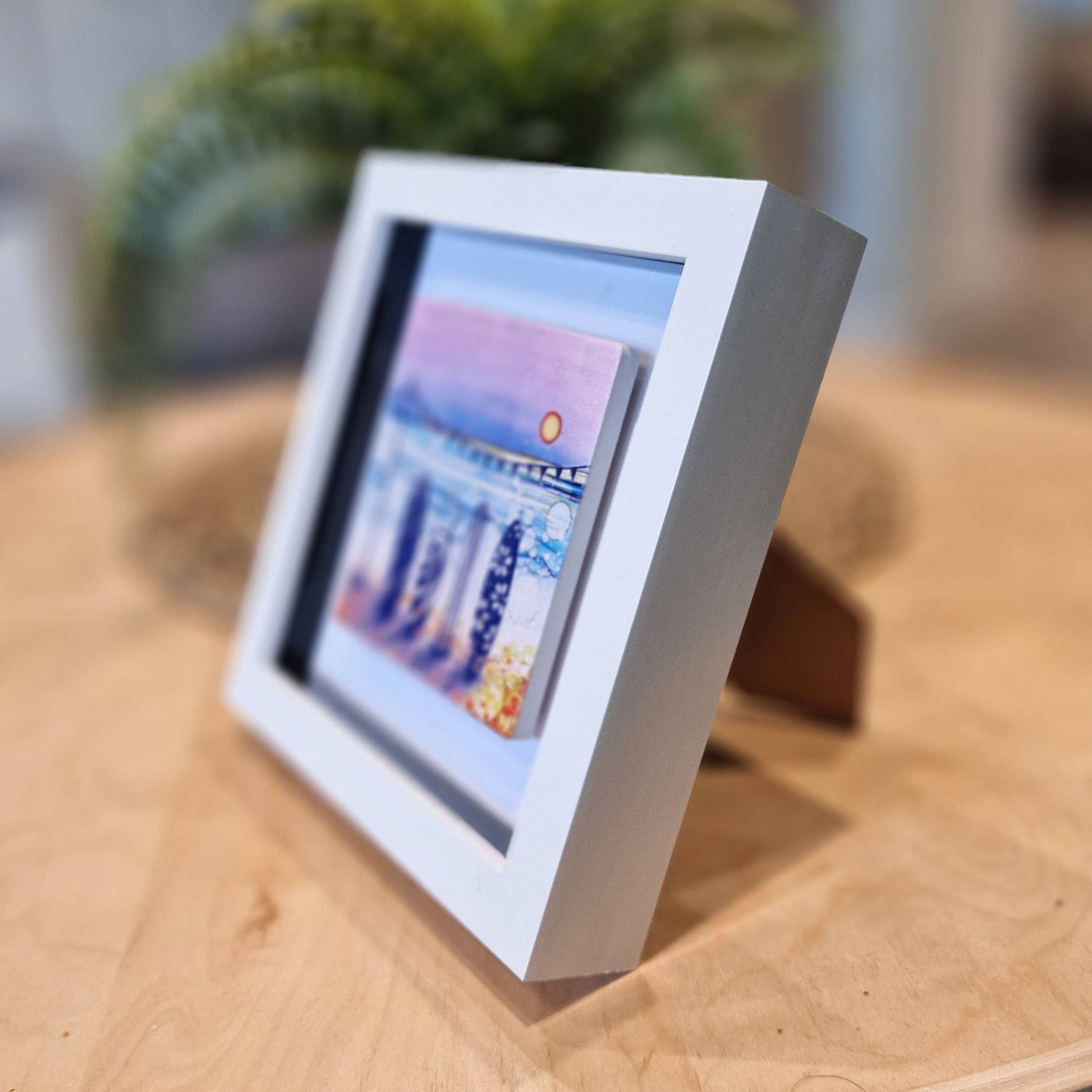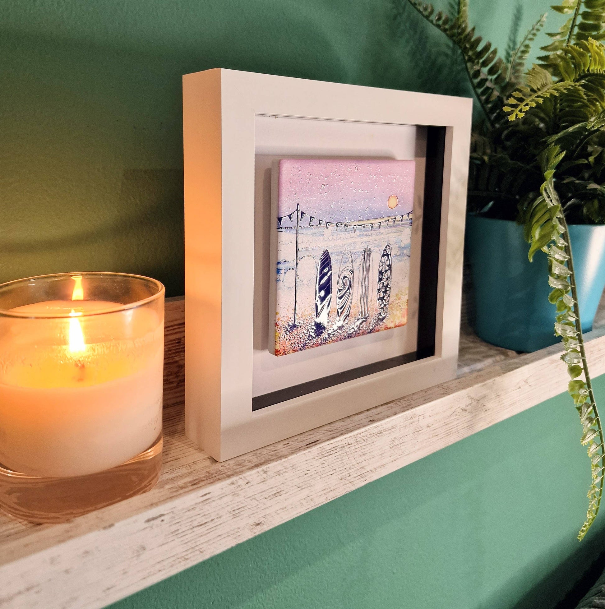 Because of the design of the frame the artwork can be hung on a wall, stand solo on a shelf or be leant back on their stand.