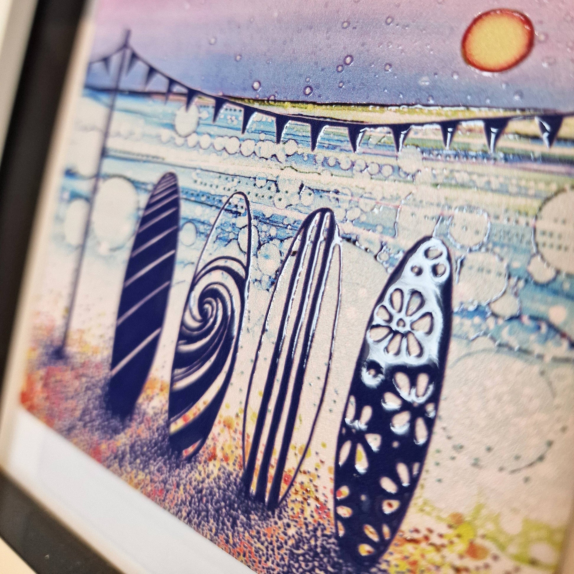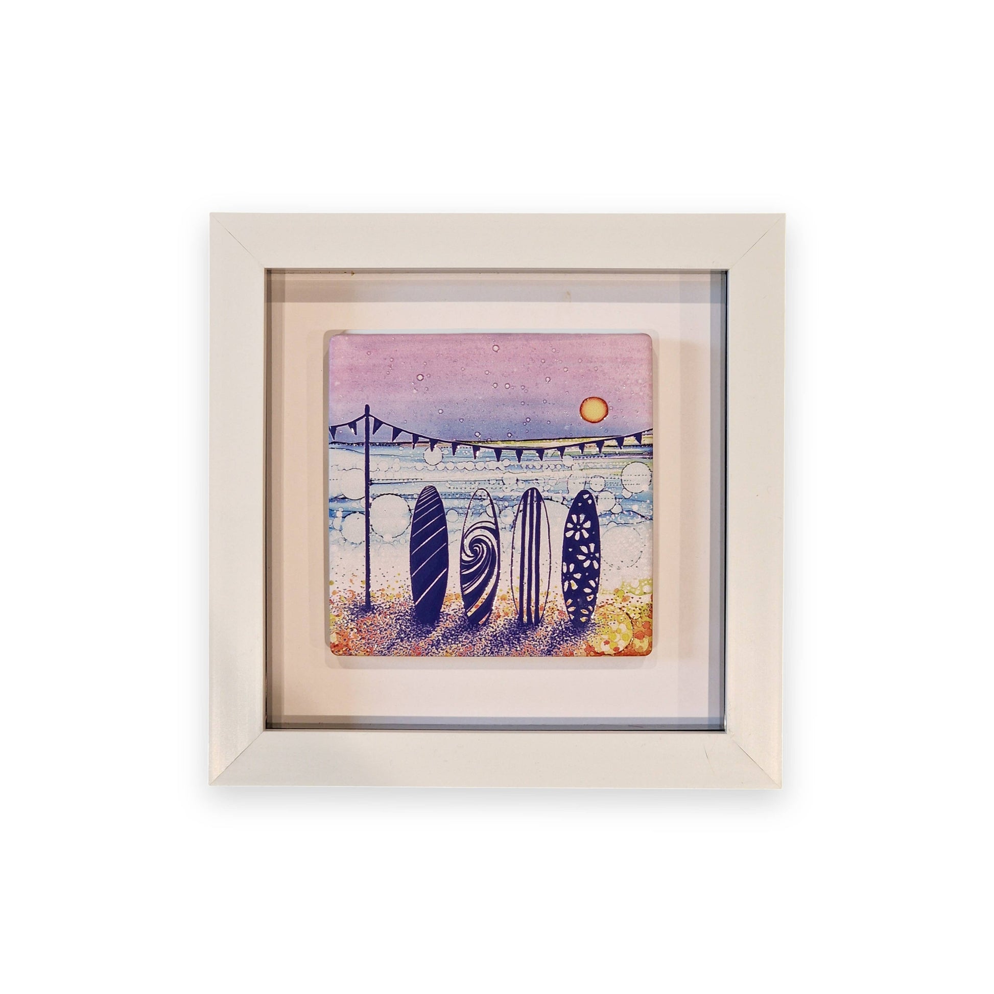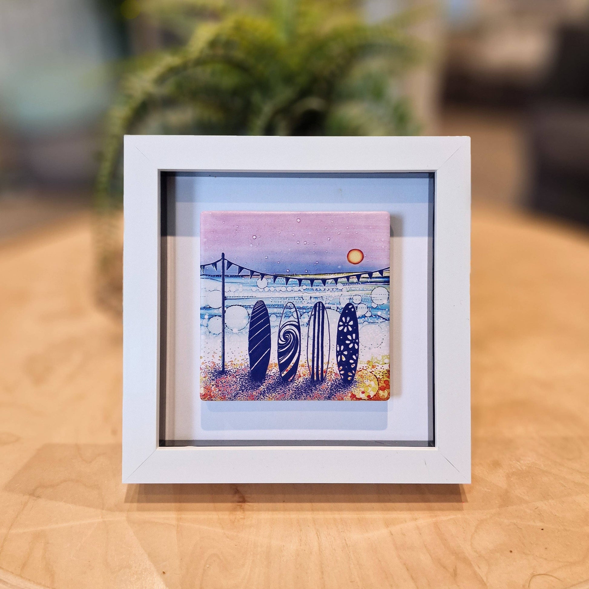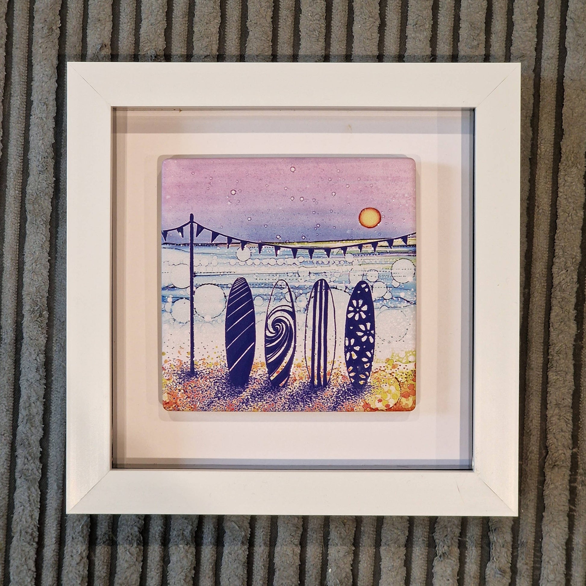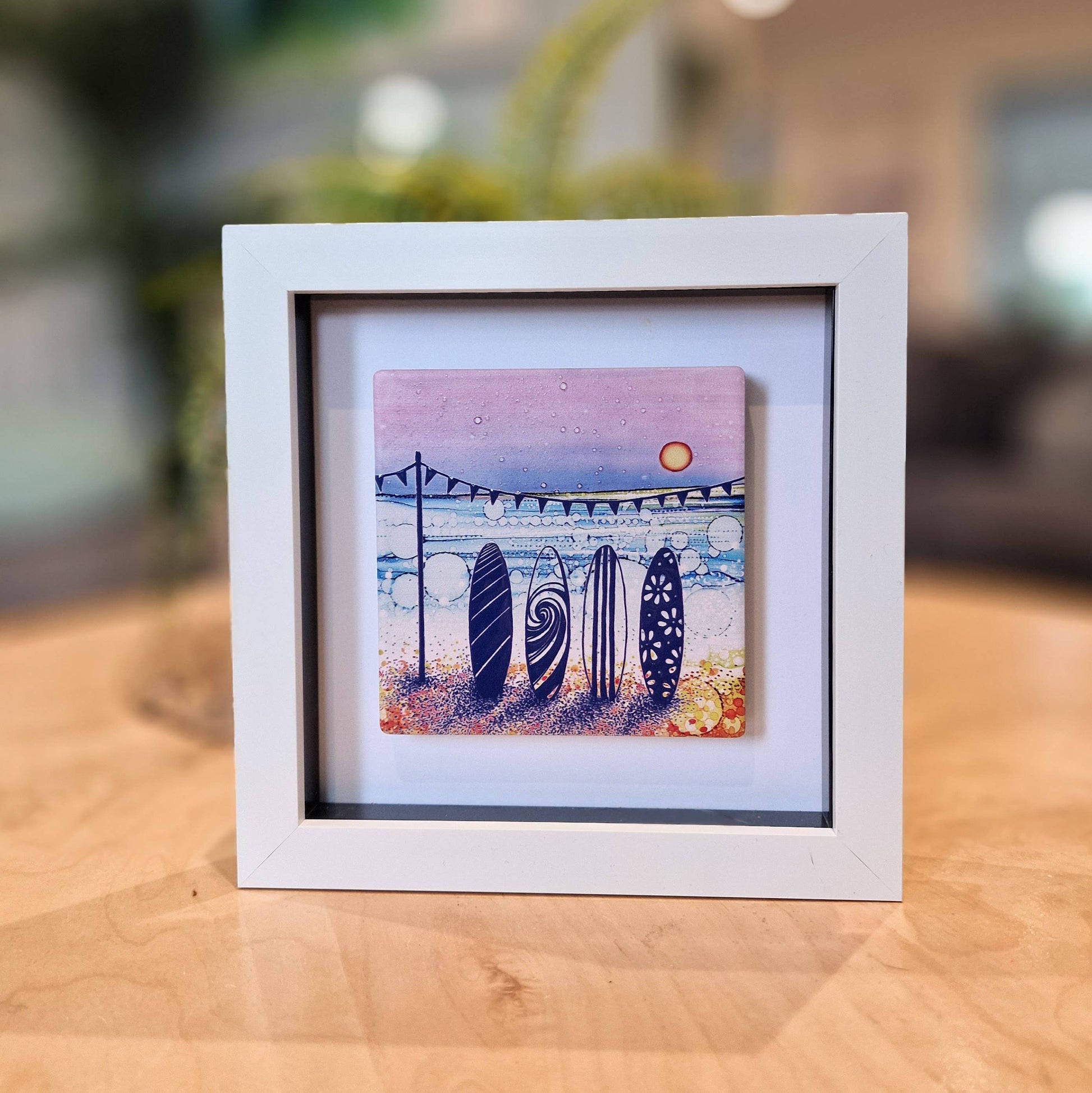 Because of the design of the frame the artwork can be hung on a wall, stand solo on a shelf or be leant back on their stand.