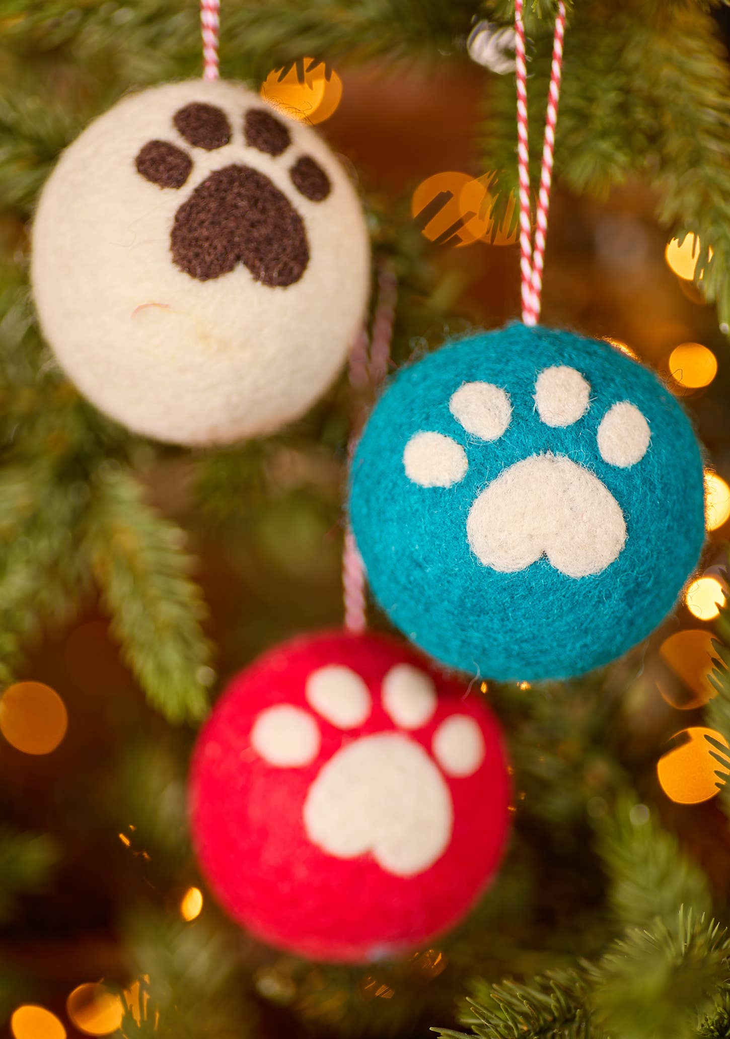 A round wool felt bauble in 3 colourways decorated with dog paw prints. Fitted with a red and white hanging thread. From a new range of sustainable eco friendly Christmas decoration ideas designed in-house at Namaste.