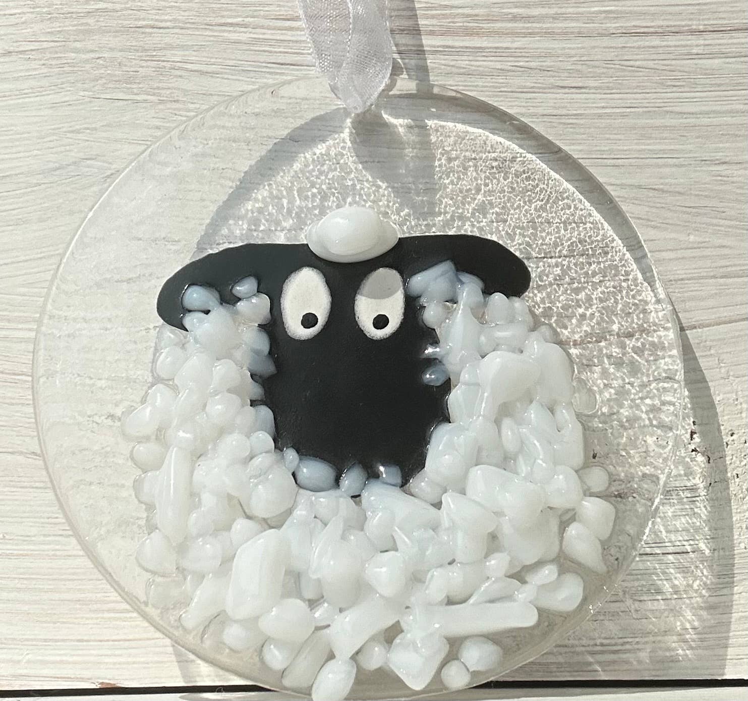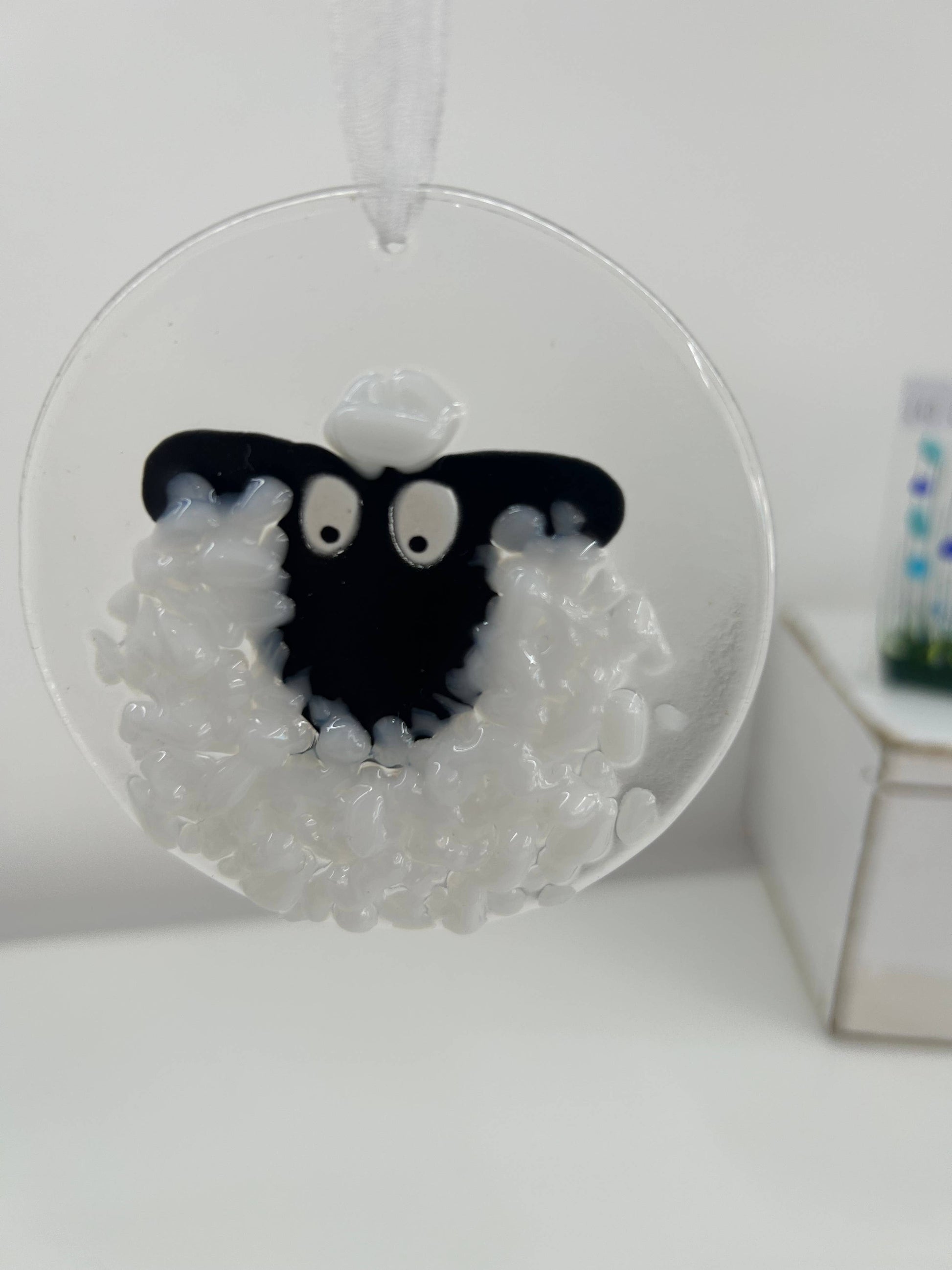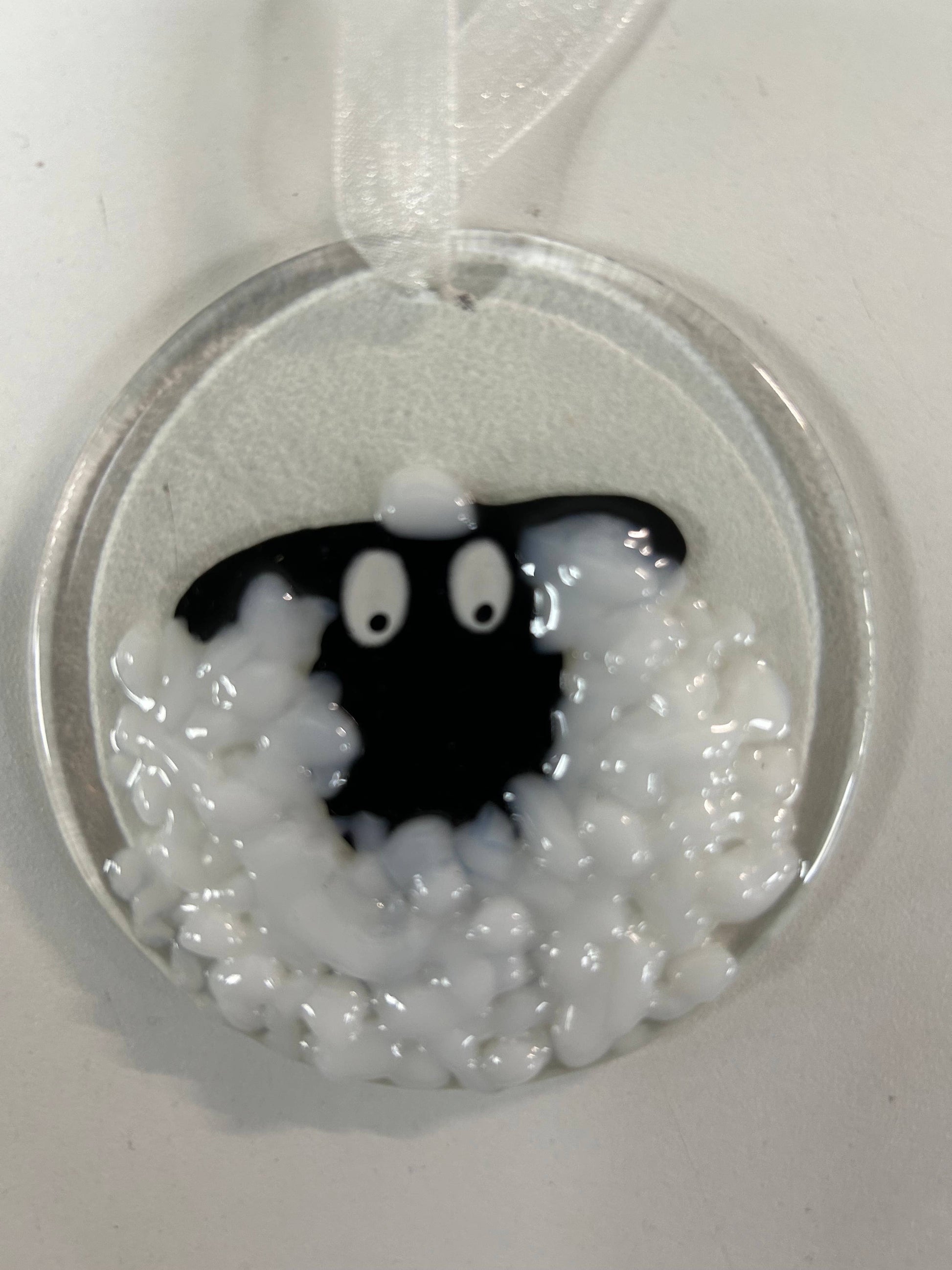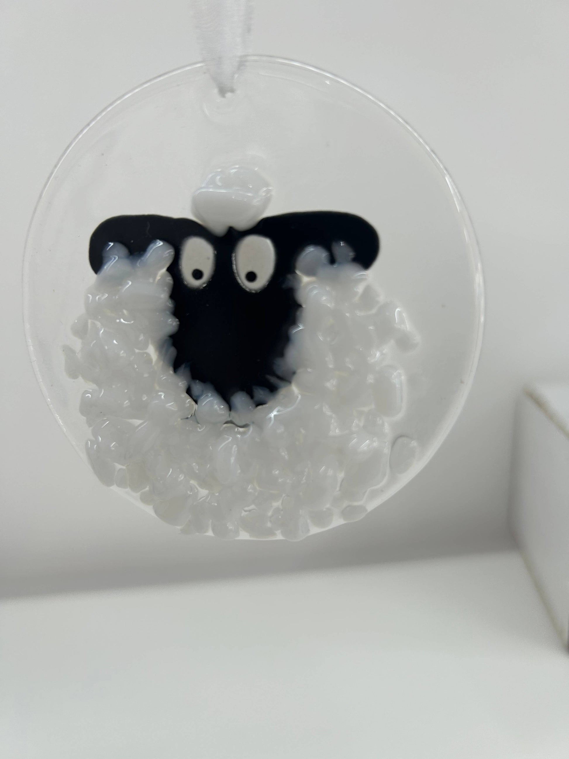 Fused Glass Round Sheep Hanging Ornament - white & black