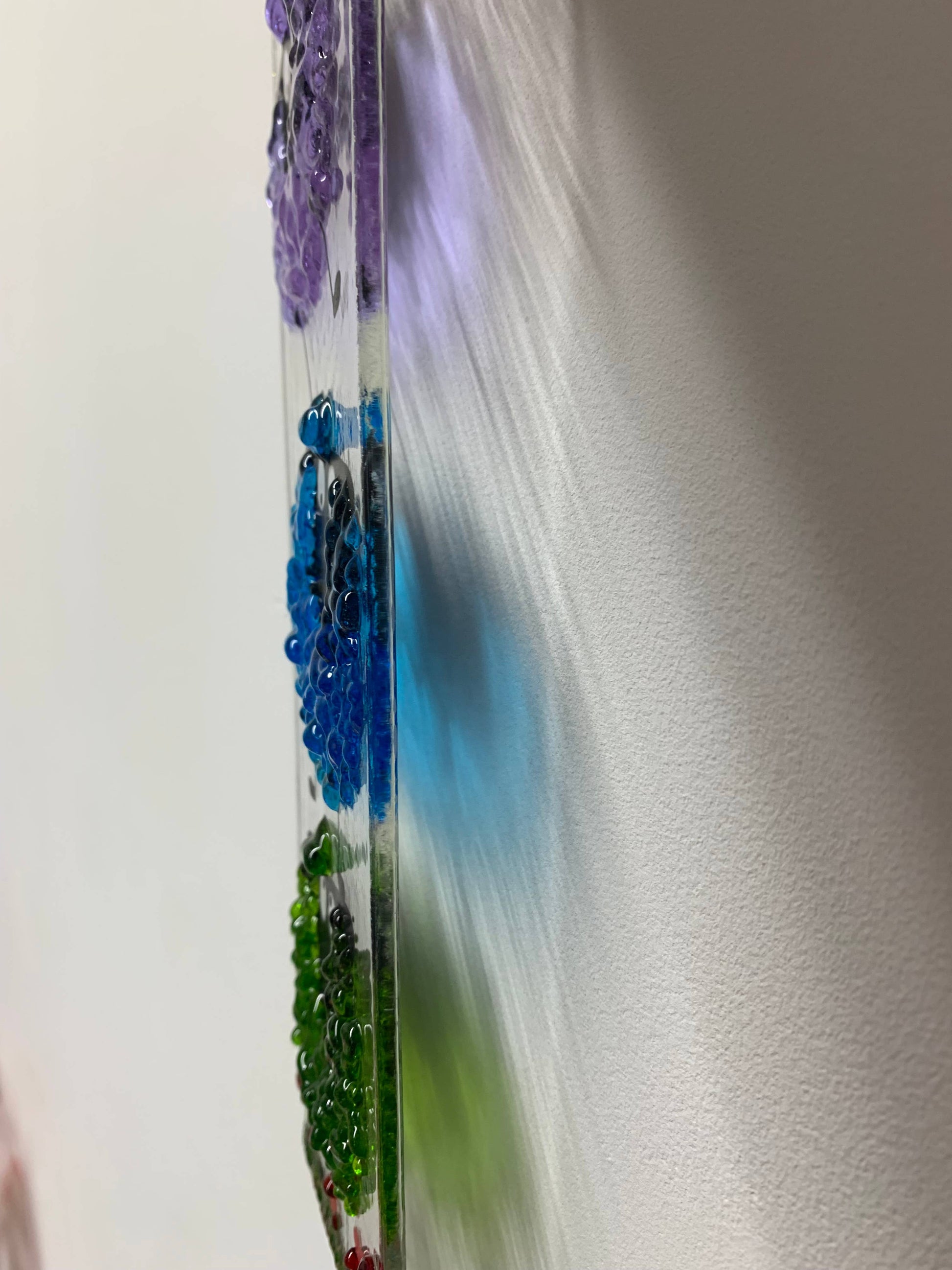 This bright glass starts life as a rectangular hand-cut piece of clear artisan glass. Different coloured glass is then cut and placed on top to finish the effect before firing in a kiln at approx. 800℃ to fuse all the elements together.