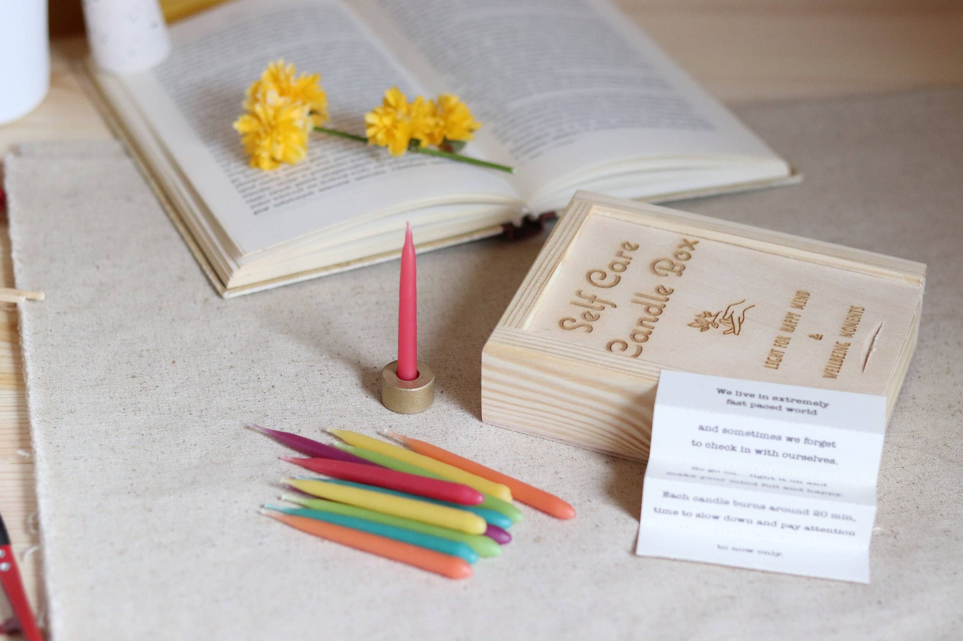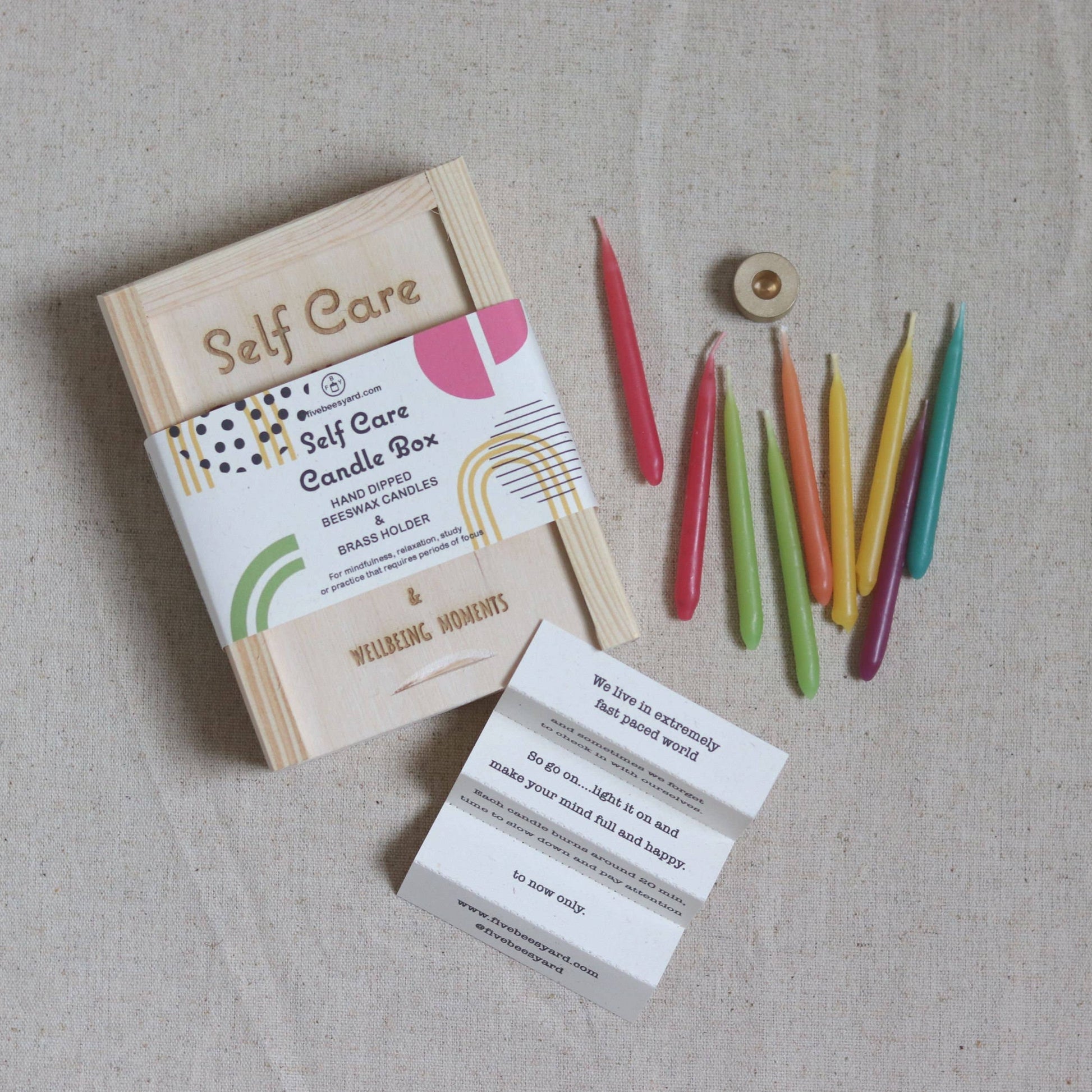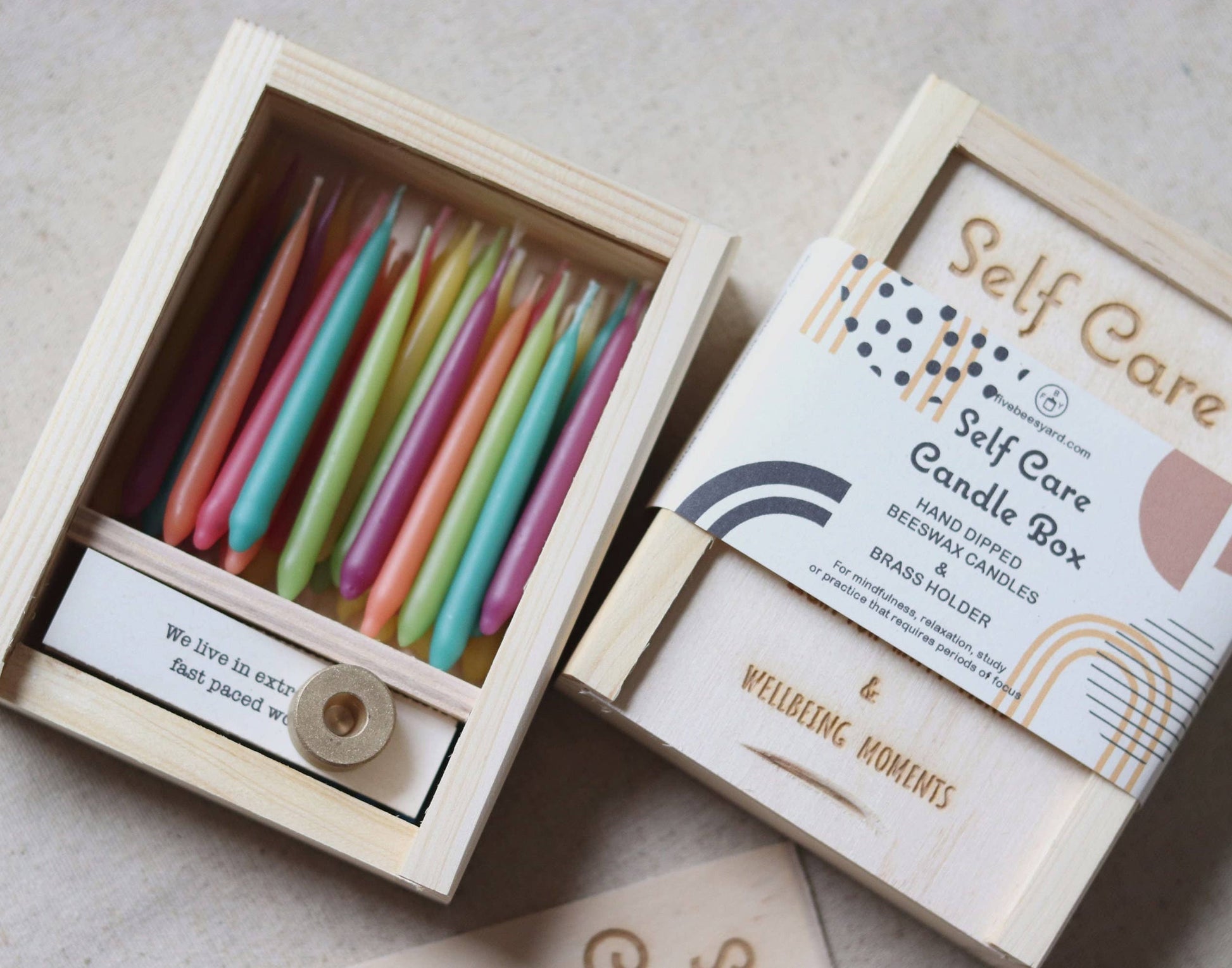 Box contains brass candle holder with 20 hand dipped raw beeswax candles in pastel colours.