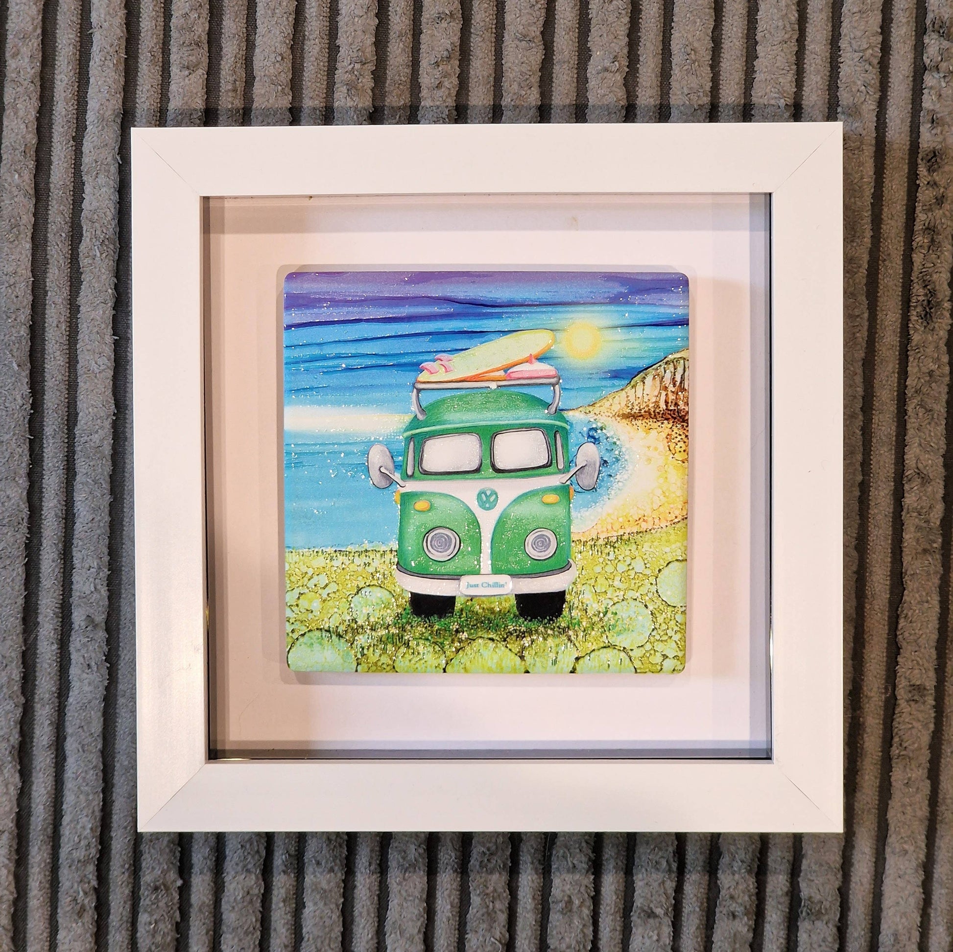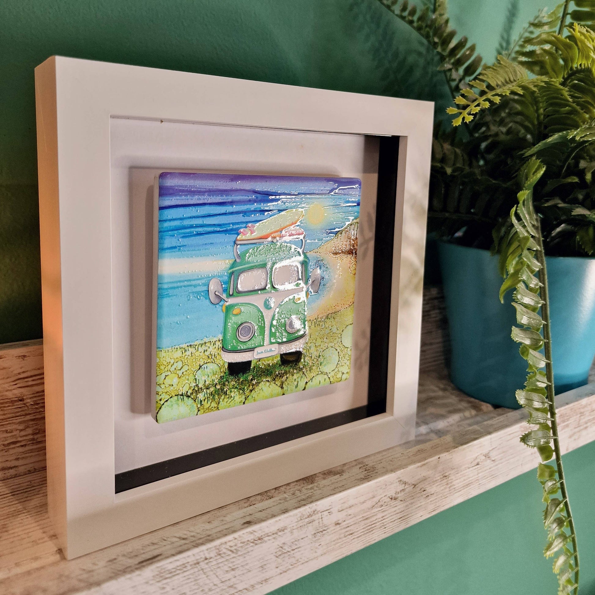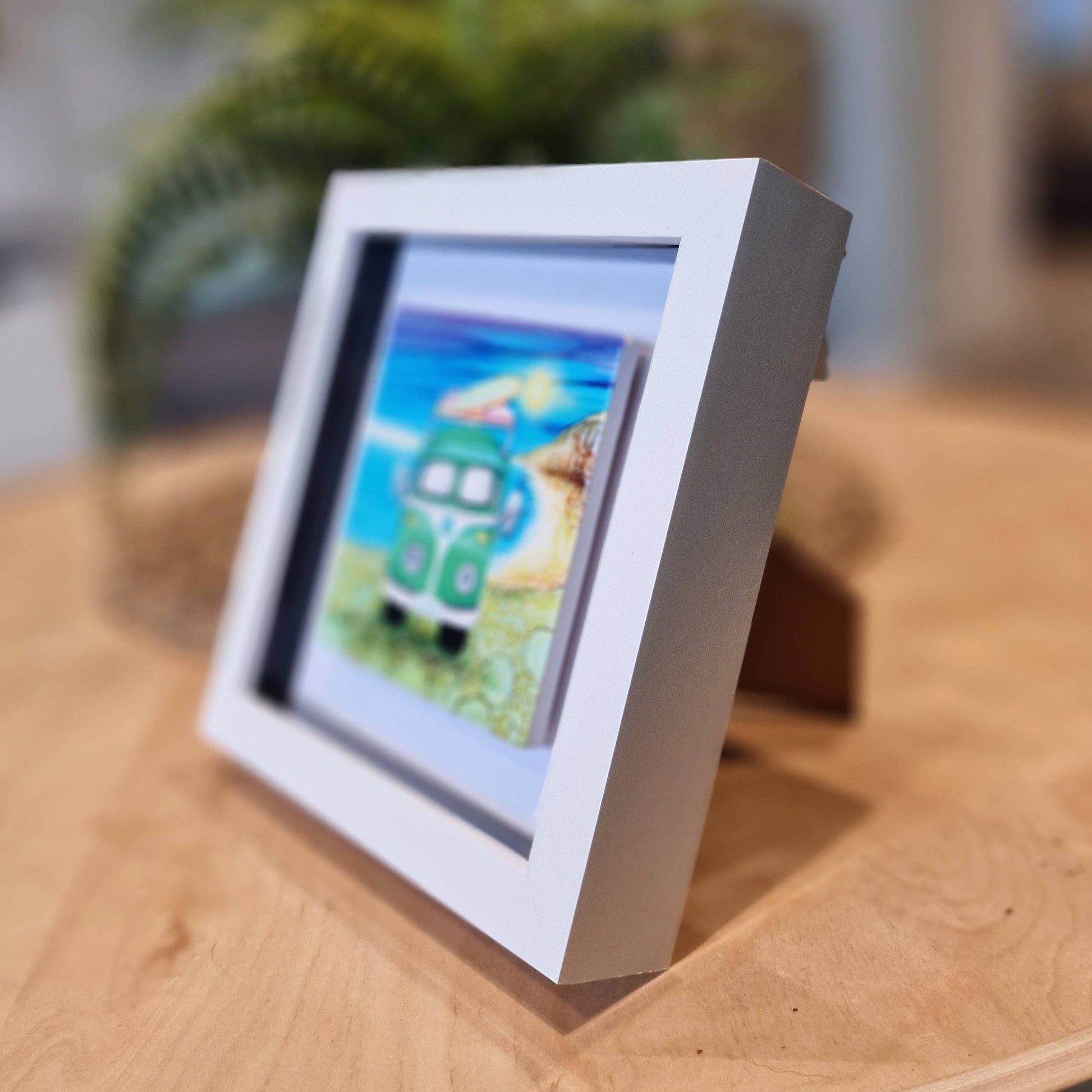 Because of the design of the frame the artwork can be hung on a wall, stand solo on a shelf or be leant back on their stand.