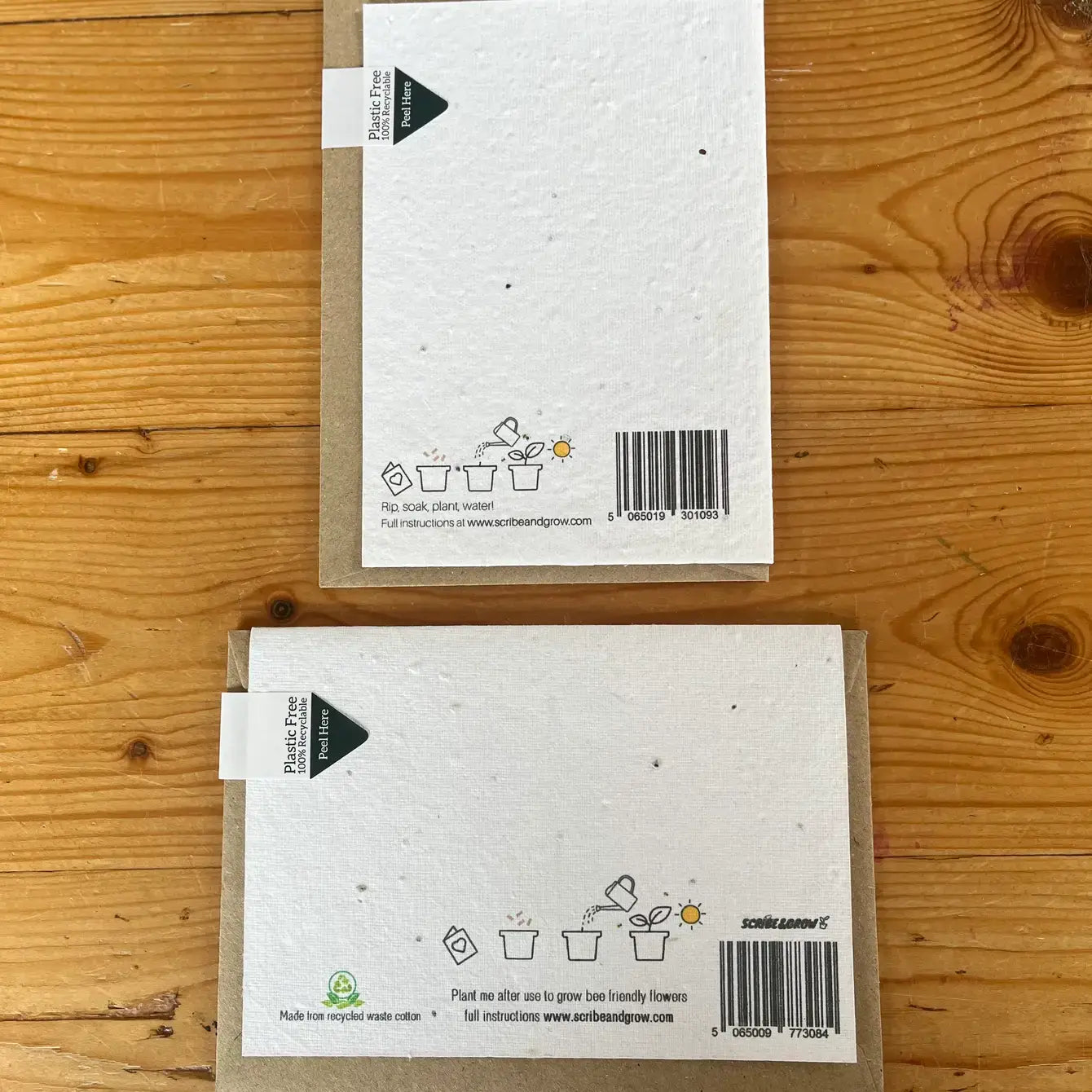 Handmade, packed full of bee-friendly flower seeds and made from 100% Pre-consumer recycled cotton or FSC certified wood pulp + kraft envelope and compostable sleeve