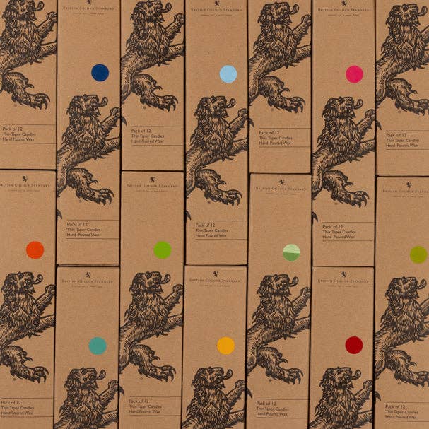 Our eco, fair trade dinner candles, here in a new thinner style, perfect for birthdays, celebrations and tablescaping in an array of British Colour Standard archival colours.